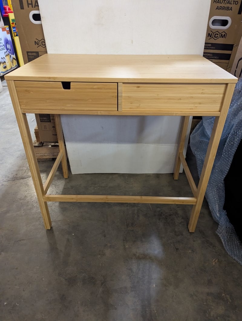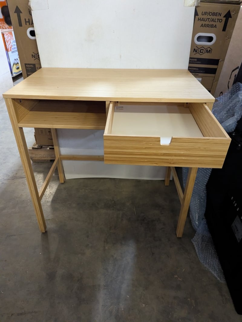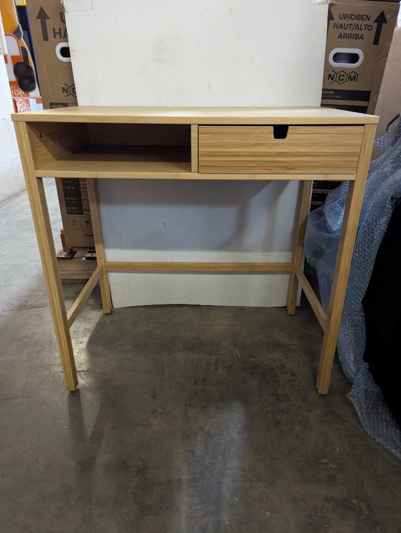 Desk, tan timber style, one drawerDimensions: 76cm x W 77cm x D 47cm