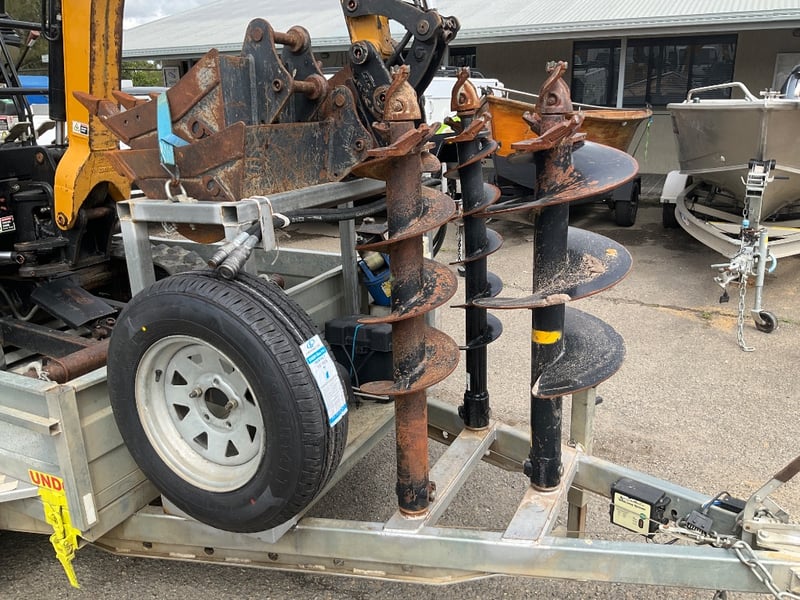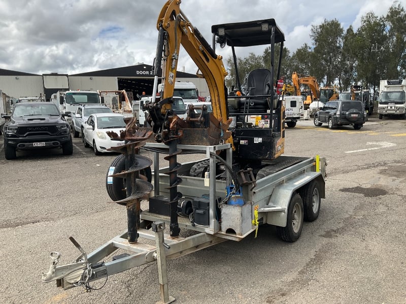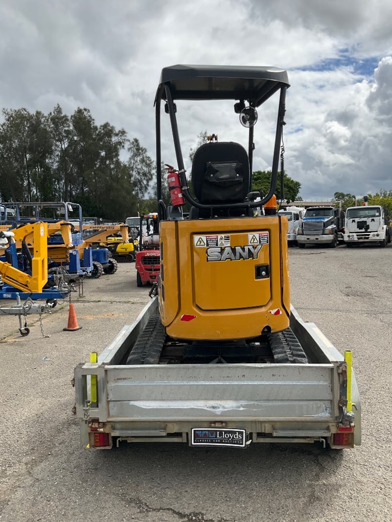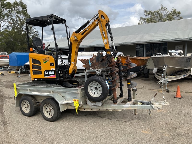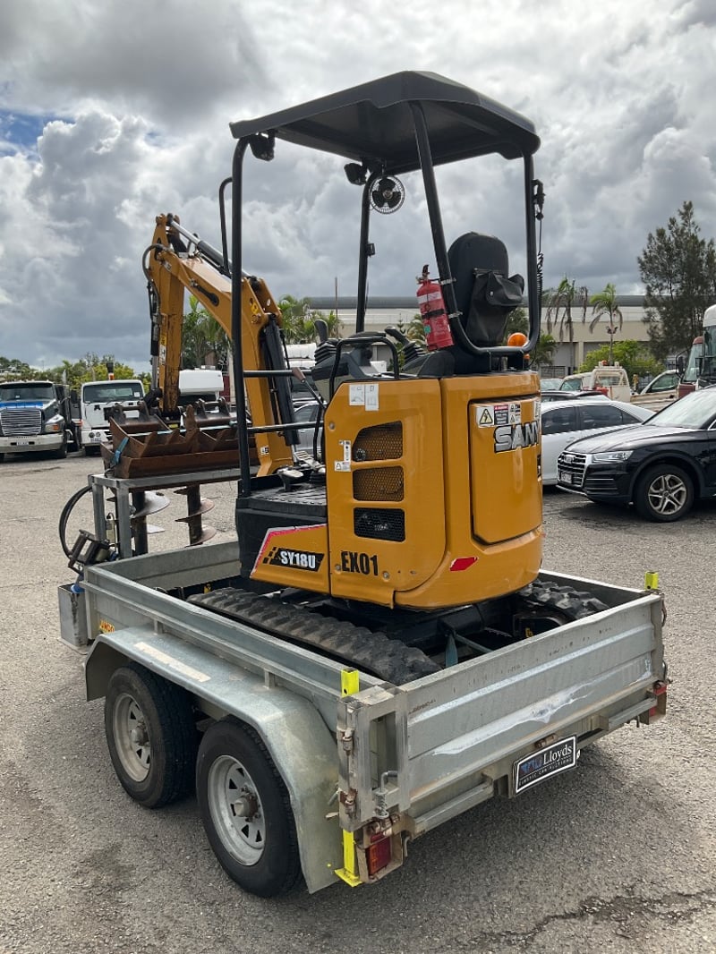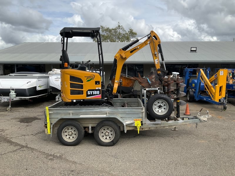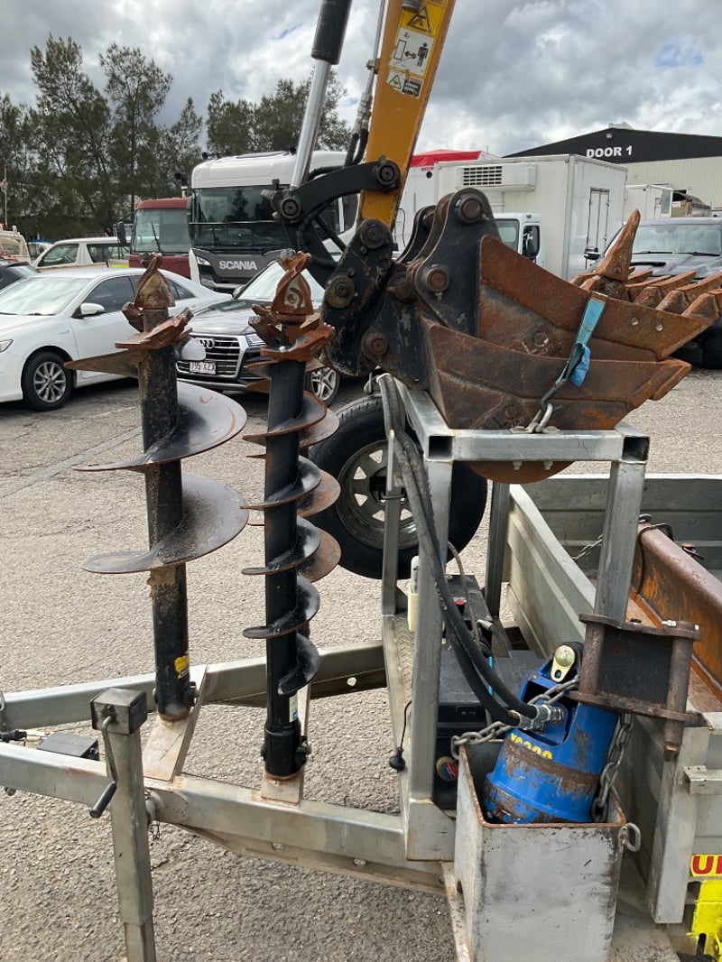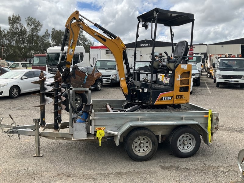 Vendor Advises: 2023 Sany 1.95T Excavator setup, with remainder of 5yr/ 5000 hr warranty. This machine is a zero swing, tight access machine with expandable tracks from 990mm - 1350mm, complete with a quick hitch 300mm & 450mm digging buckets, 1m mud bucket & ripper. The setup also includes an Auger Torque 2000 auger drive with 200mm, 300mm and 450mm augers. This equipment sits on top of an Aussie built 3.2T 12v hydraulic tipper trailer with Elec brake Bluetooth braking system to suit any vehicle.