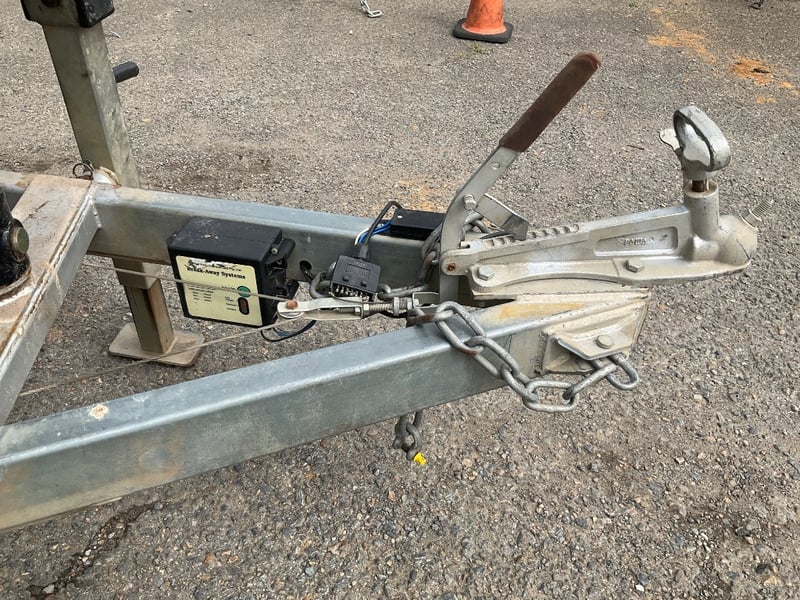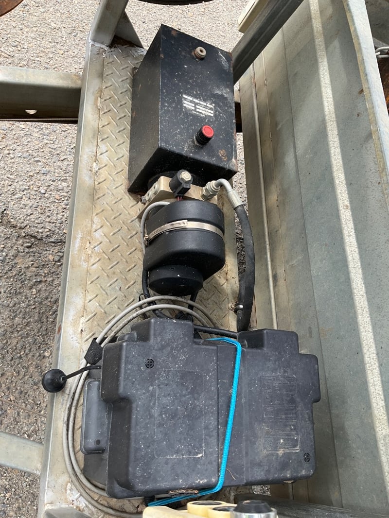 Description: custom trailer built for escalator and attachment, hydraulic tip trailer, twin axle, ramps, spare tyre, break away system, housing for attachments