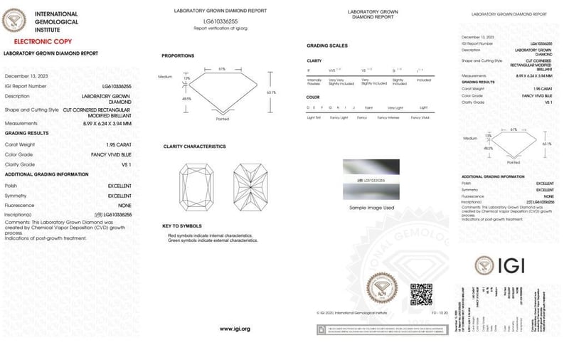1.95 CARAT RADIANT CUT DIAMOND FANCY VIVID BLUE/VS1 Igi Certificate # Lg 610336255 Laser Inscribed : Labgrown Igi Lg 61033625 Polish : Excellent Symmetry : ExcellentFlourescence : NoneType : Cvd Condition: Good - Refer Images 0488552+66