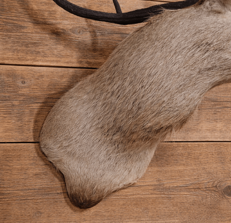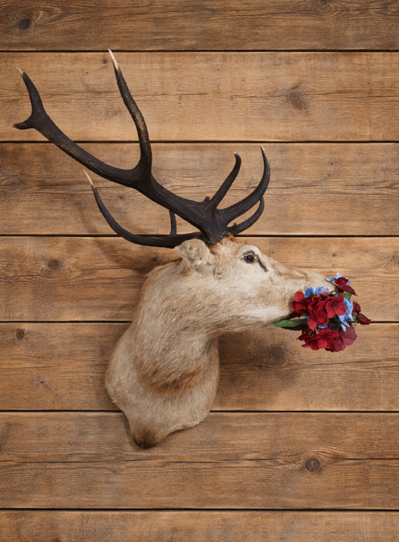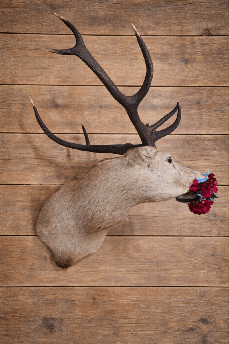TAXIDERMY DEER HEADItem Size: Height: 95cm, Width: 67cm, Depth: 95cm, Weight: 30KgTaxidermy Deer Head, Large Multi-Point Antlers, Brown And Tan Fur, Downward Angled Head, Artificial Floral Decoration, Arrangement Of Red And Blue Artificial FlowersCondition: Good - Refer To Images232943+1