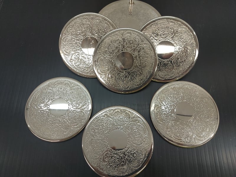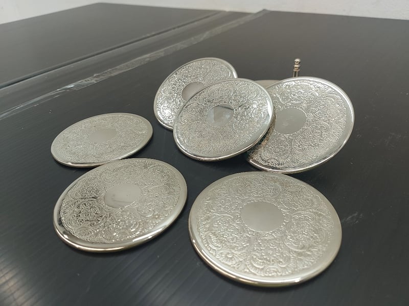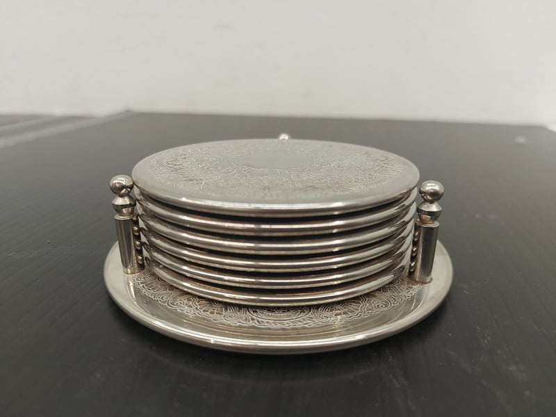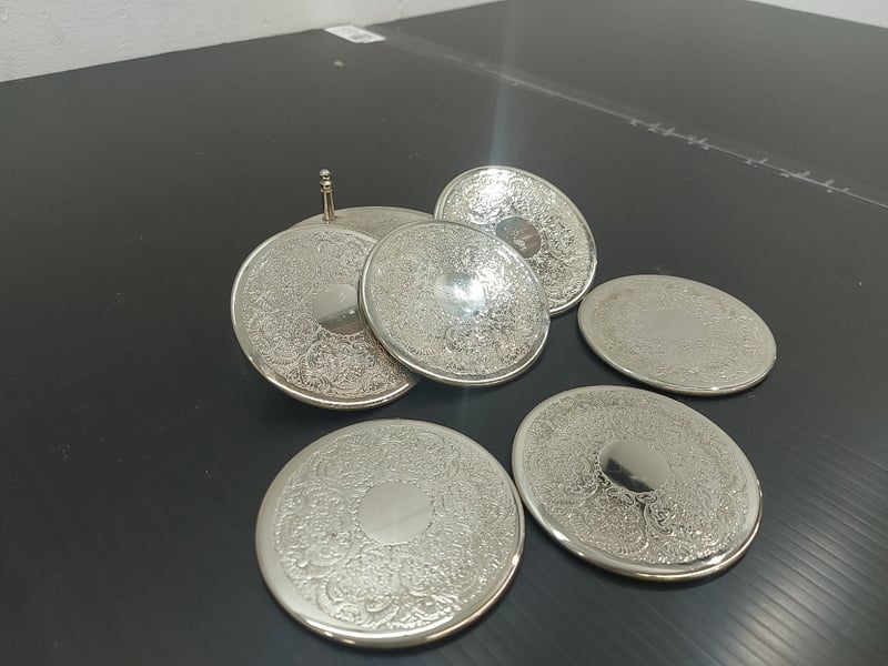 COASTERS SILVER PLATED WITH DESIGN, HOLDER, GREEN GRIP BOTTOM, QUANTITY 6Item Size: Height: 10cm, Width: 10cm, Depth: 10cm, Weight: 4KgCondition: Good - Refer To ImagesTOORMINA548655+3