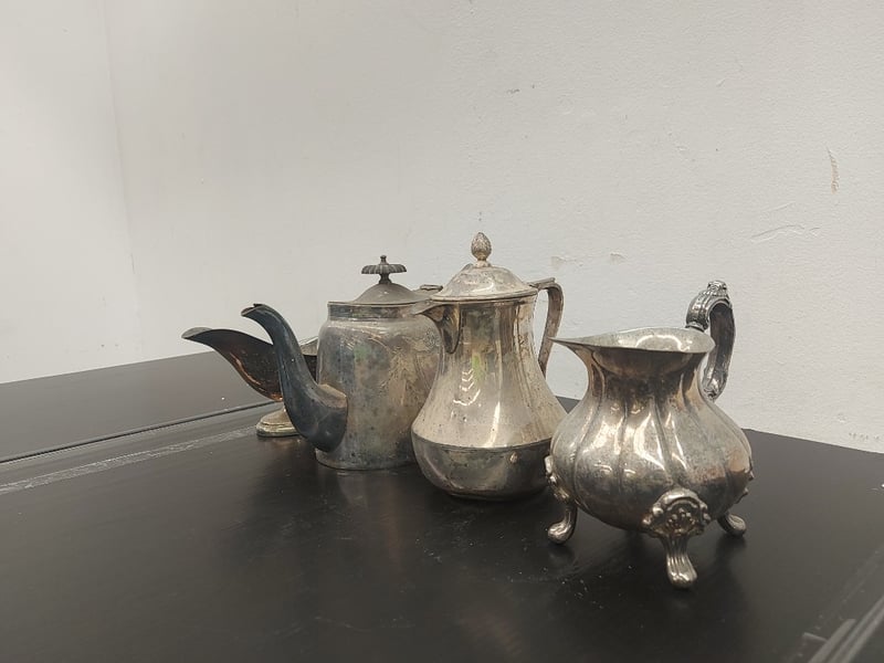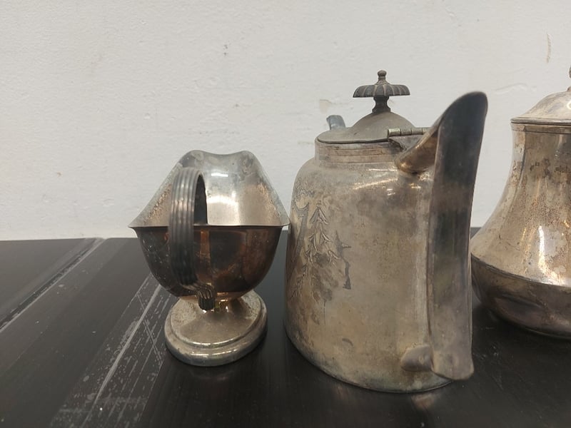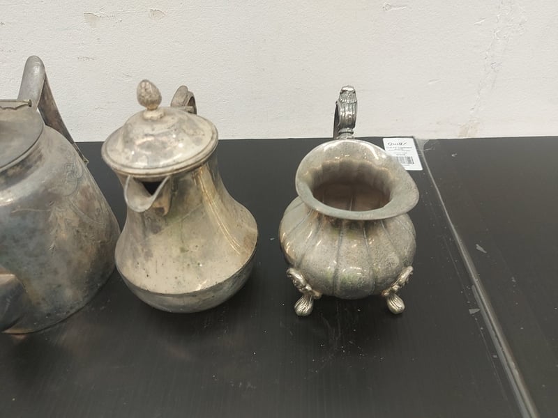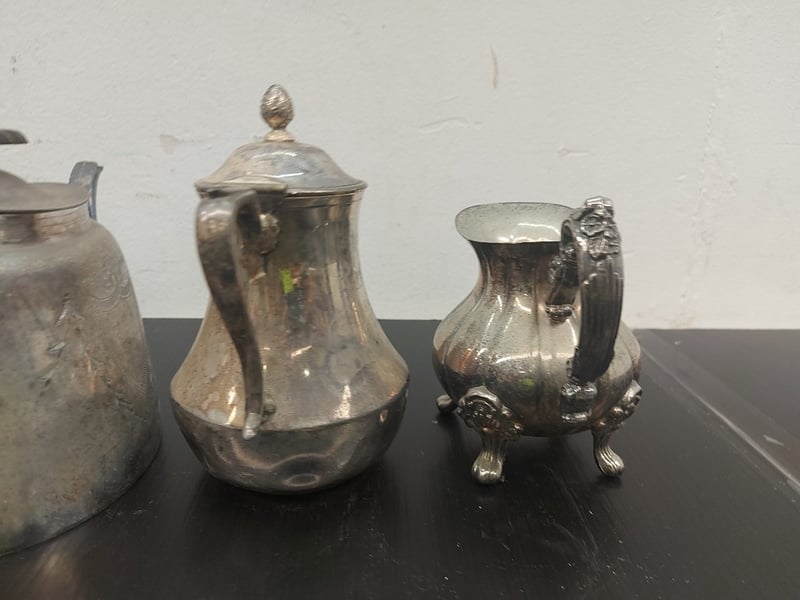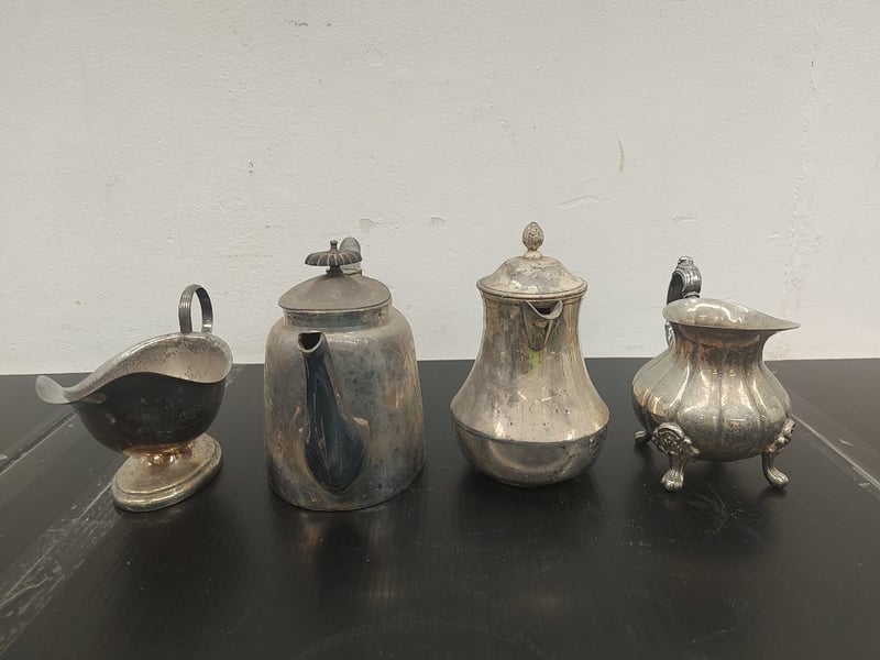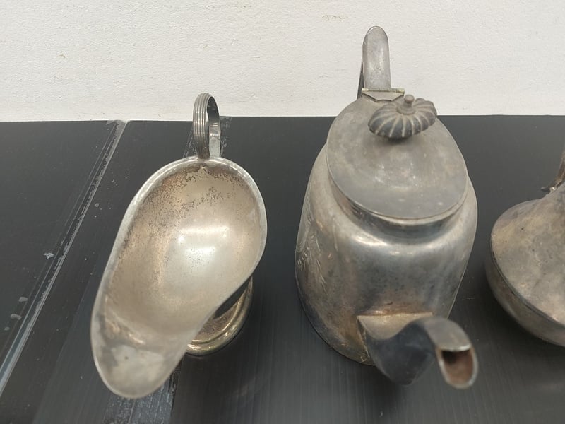SILVER PLATED COFFS POT, TEA POT, CRAMER JUG, GRAVY BOAT, QUANTITY 4