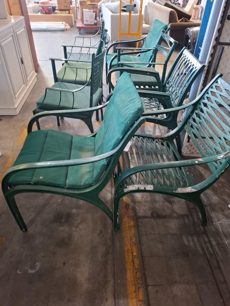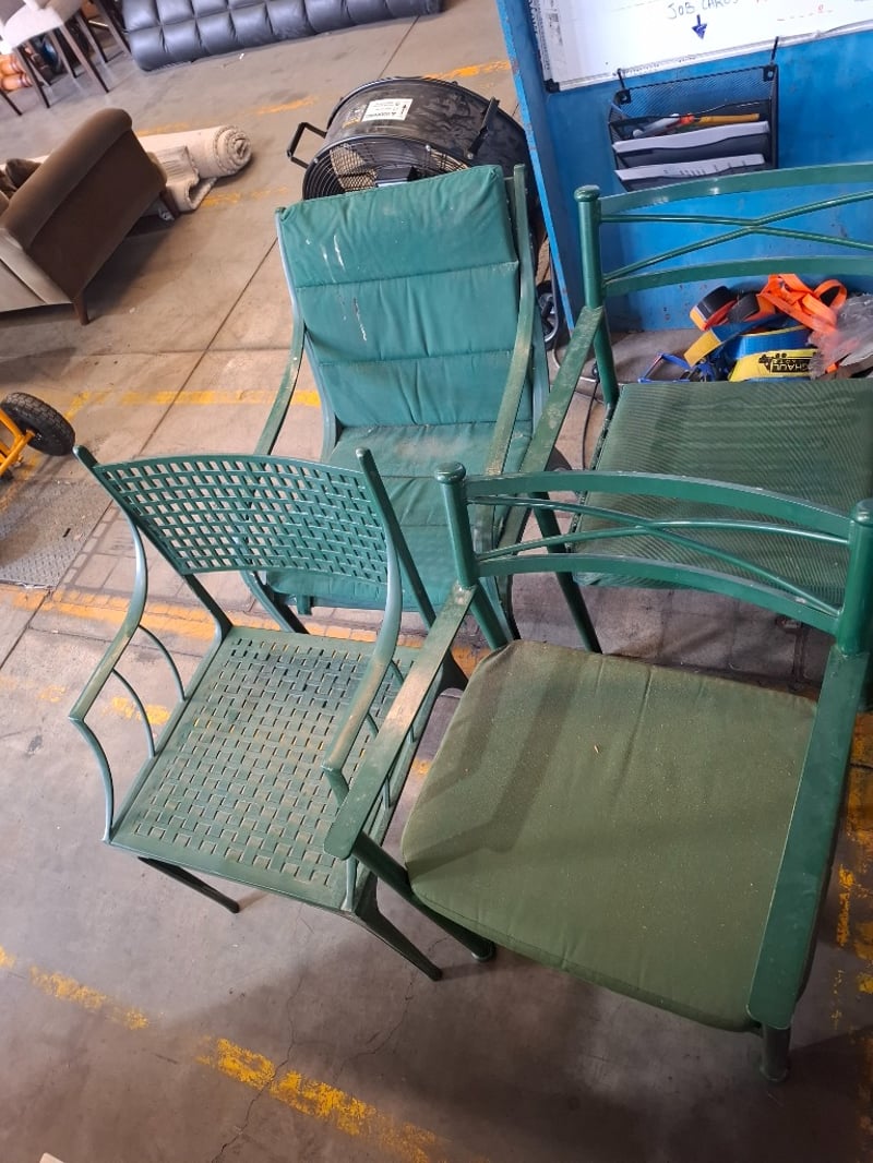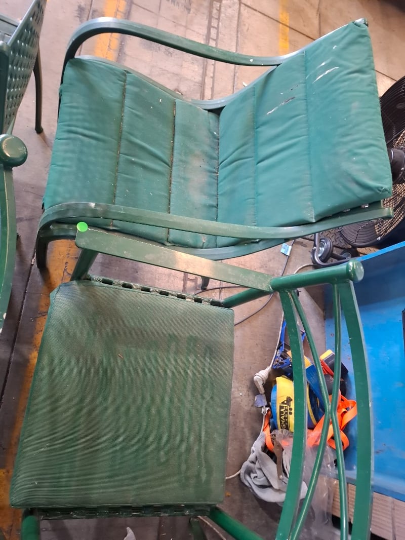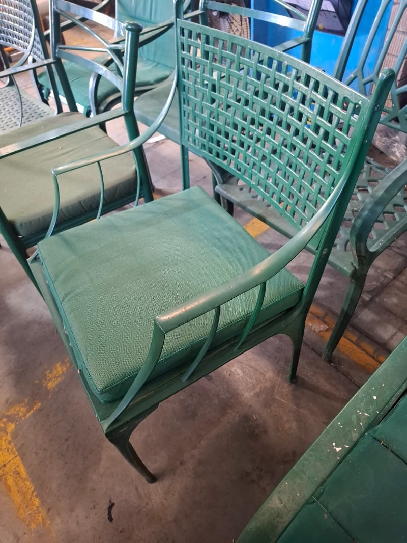 Assortment lot of outdoor green metal chairs Qty: 8 Sold as lotNote: Scuffs and marks, cleaning required