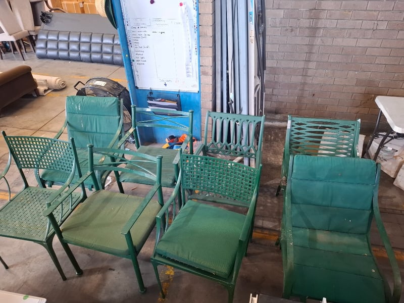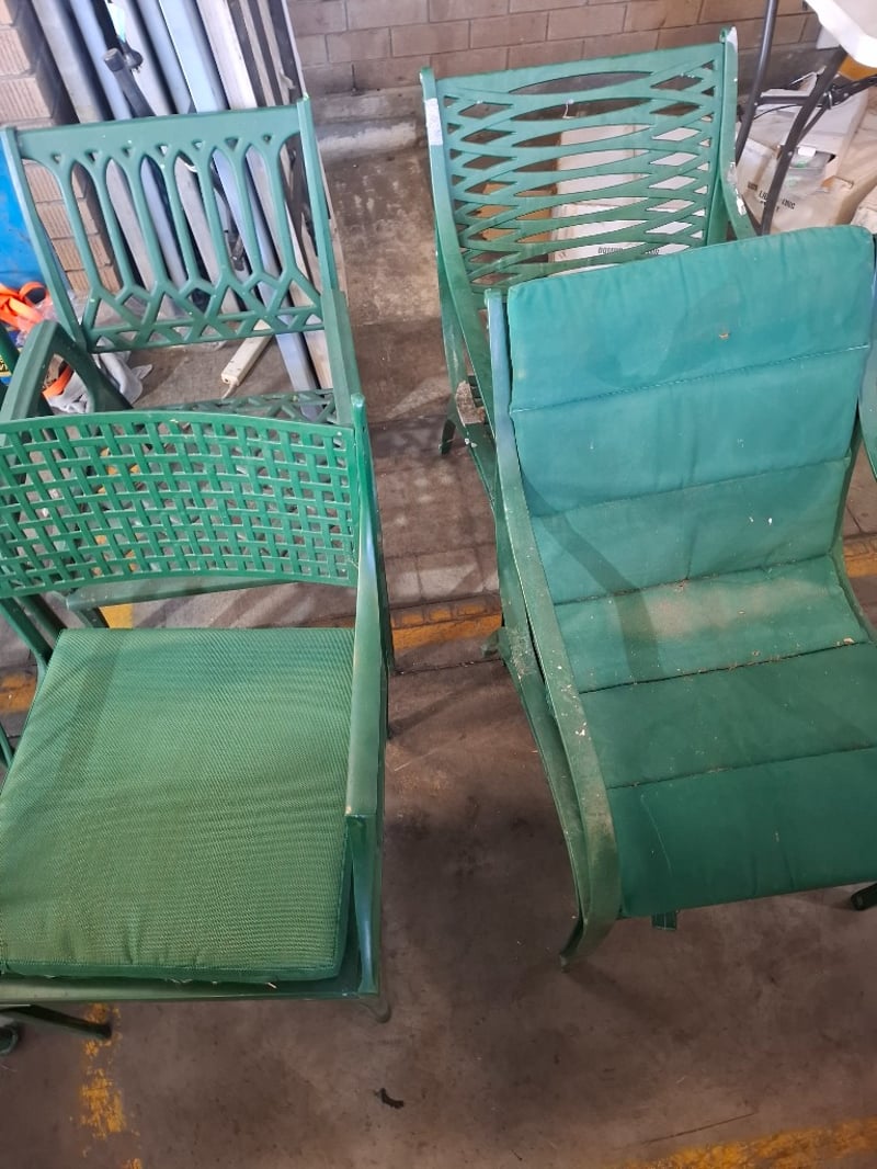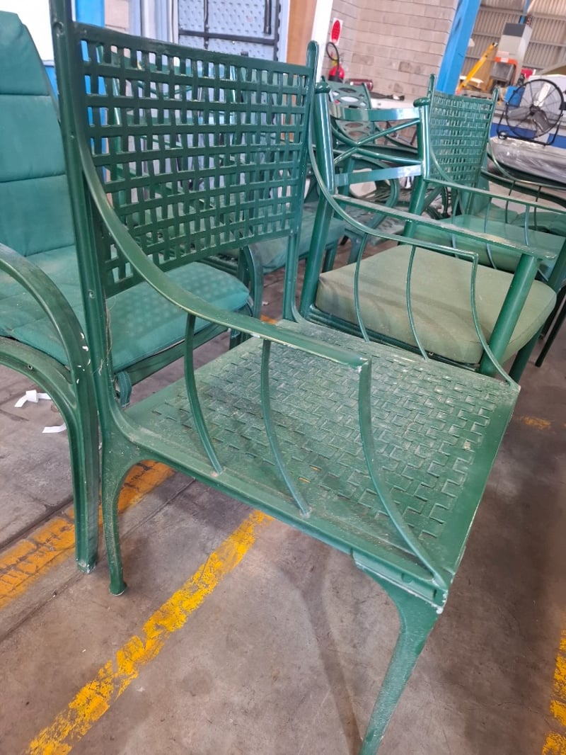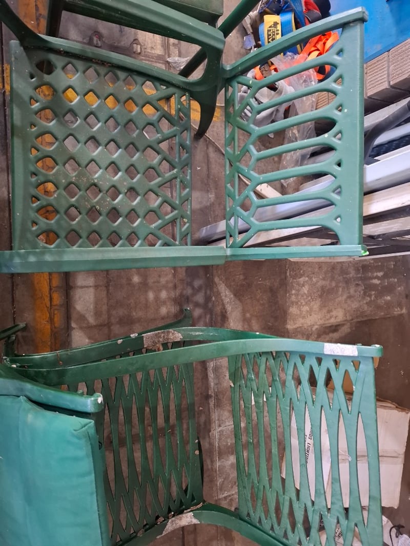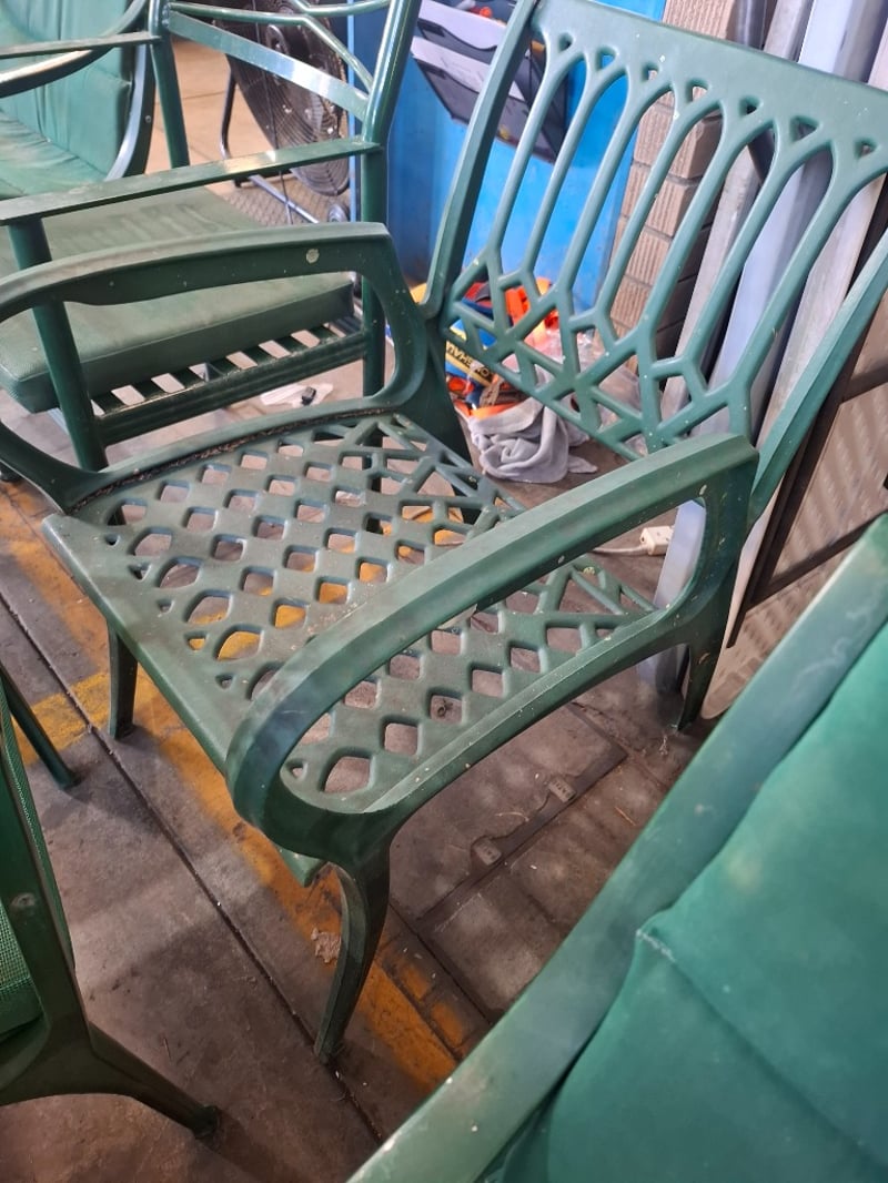 Assortment lot of outdoor green metal chairs Qty: 8 Sold as lotNote: Scuffs and marks, cleaning required