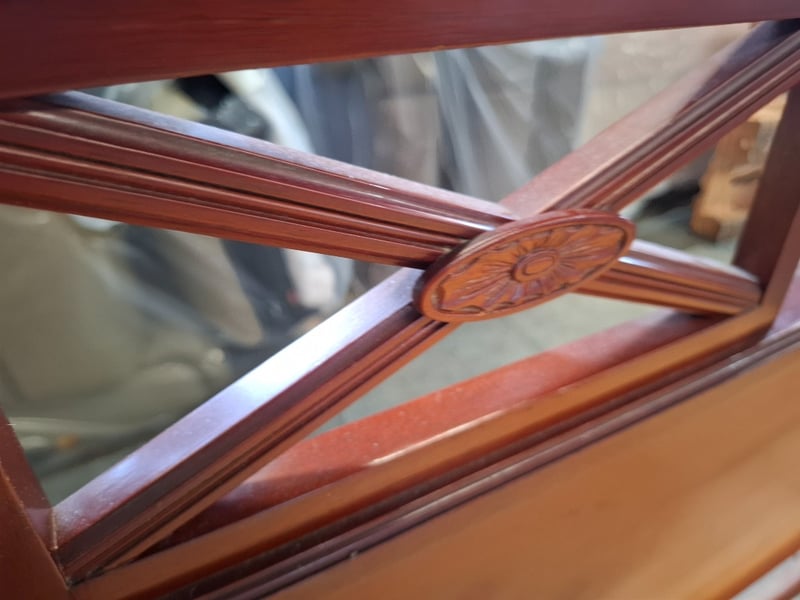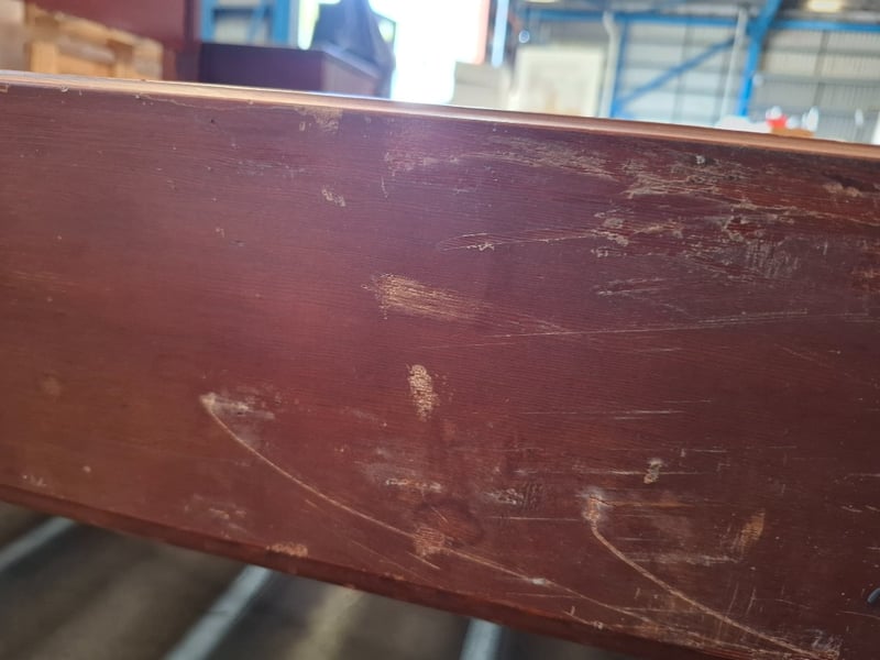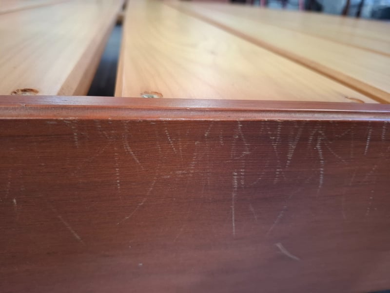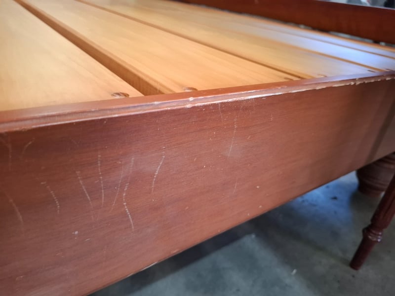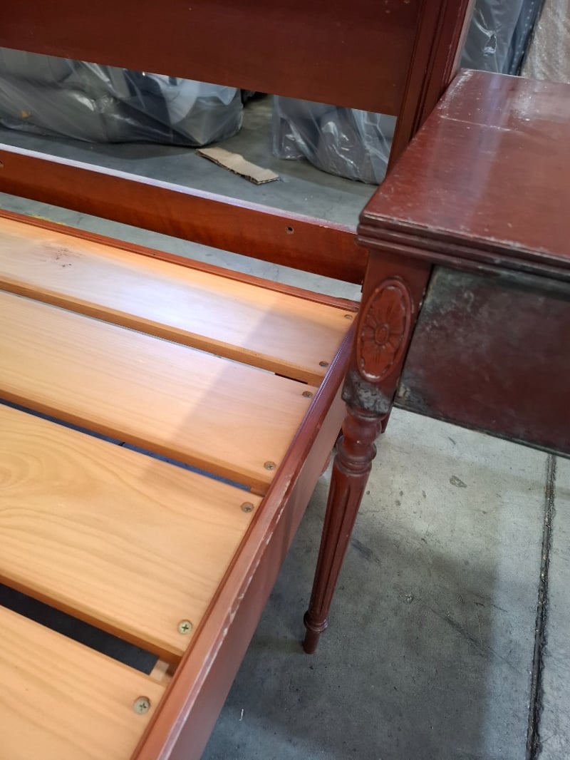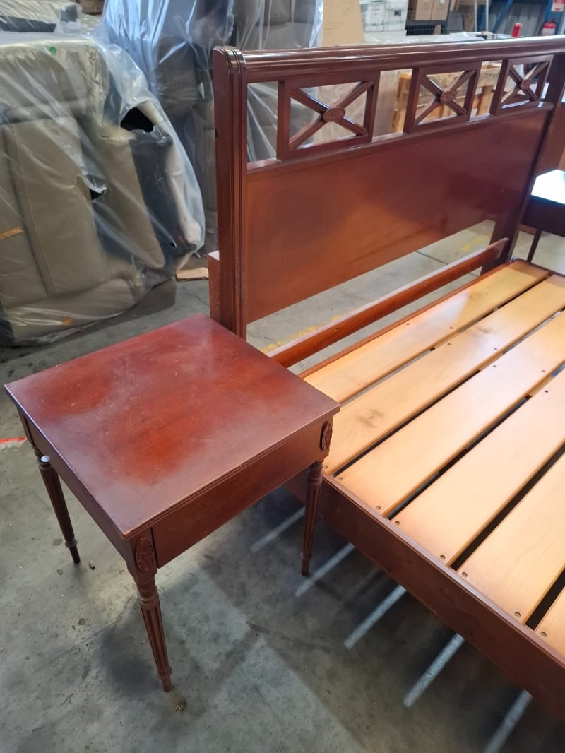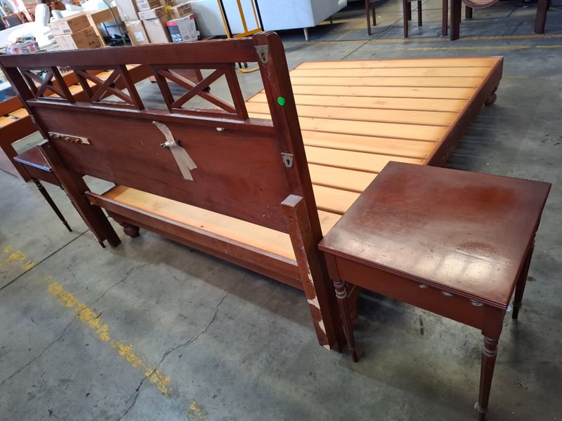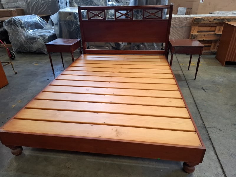 Queen Bed timber frame, two colors cherry and redish brown, includes 2 sides table and bed head Note: bed frame and bed head don't attach, diferent models , scratches, cleaning required