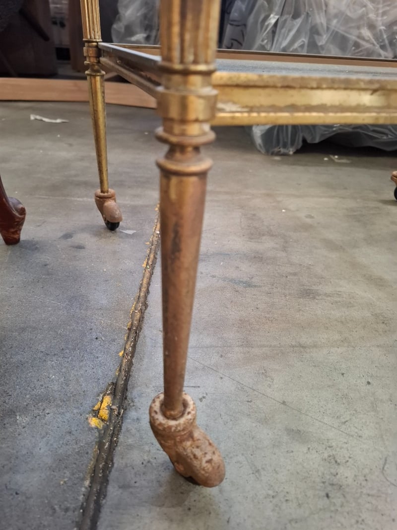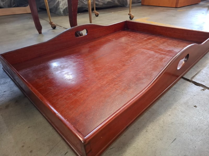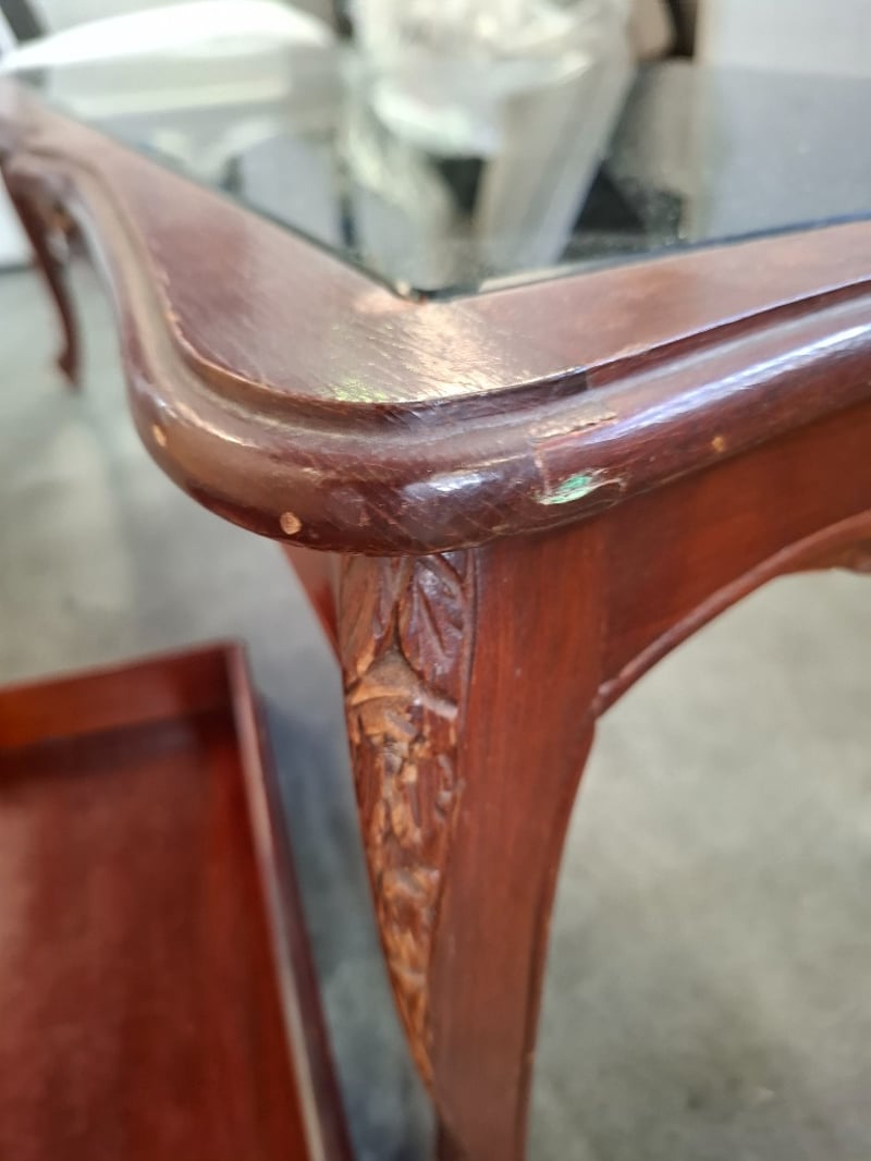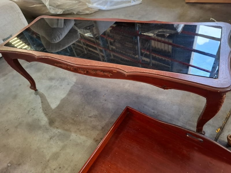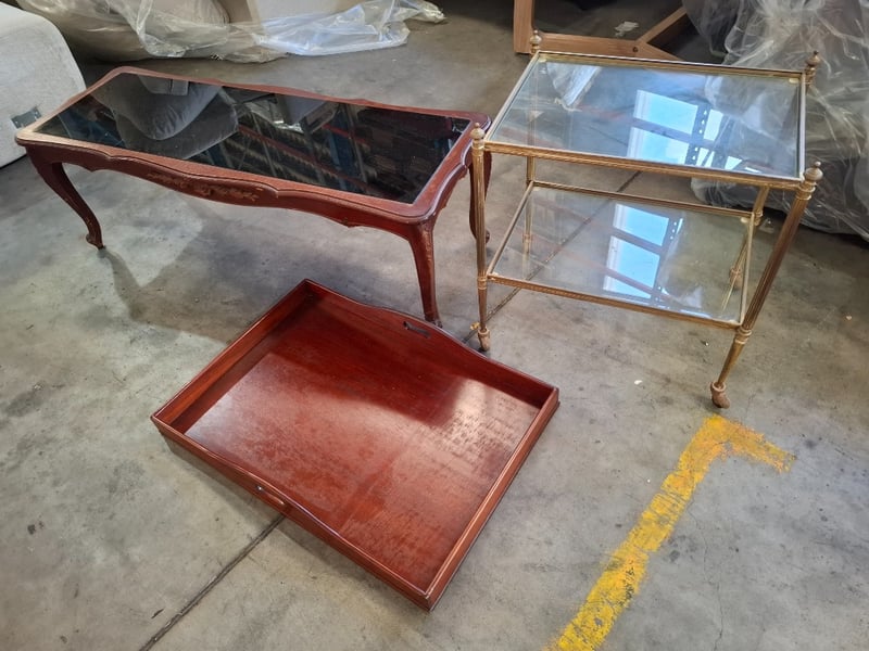 1 x timber coffee table glass top, 1 x glass metal side table, 1 x timber tray Sold as lot