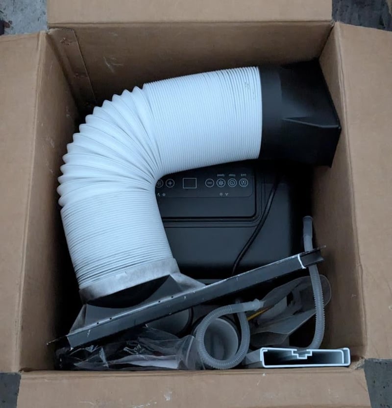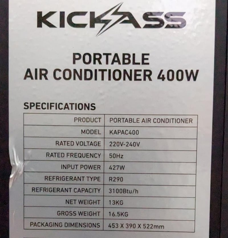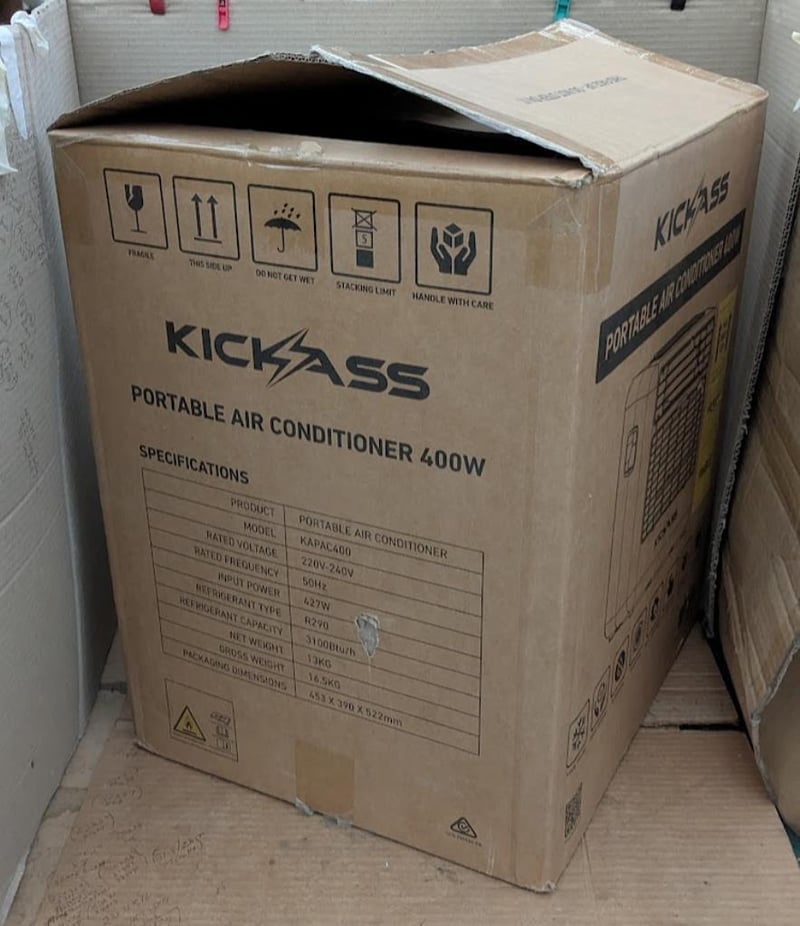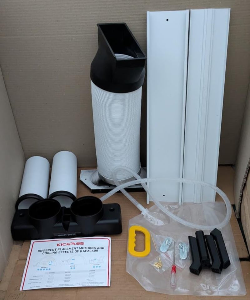 KICKASS portable air conditioner 400 watts with attachments and remote controller to box