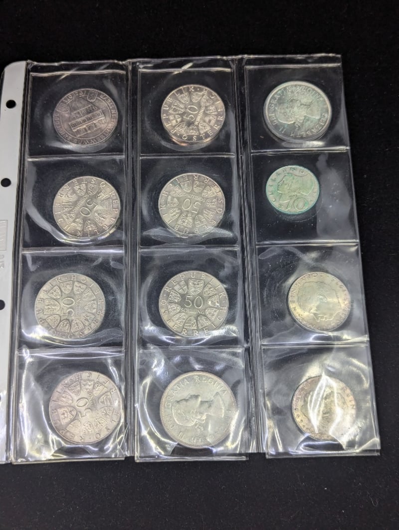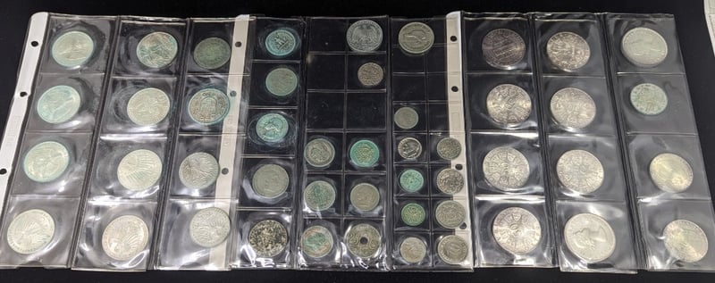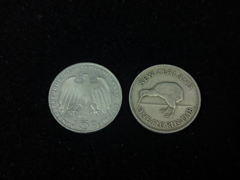 collection of world coins including 1967 republik osterreich 50 schilling coin, 1948 new zealand one florin, 1983 five deutsche mark coin, usa coins, etc