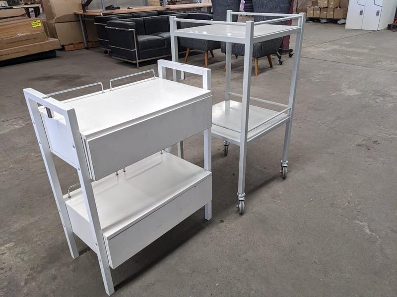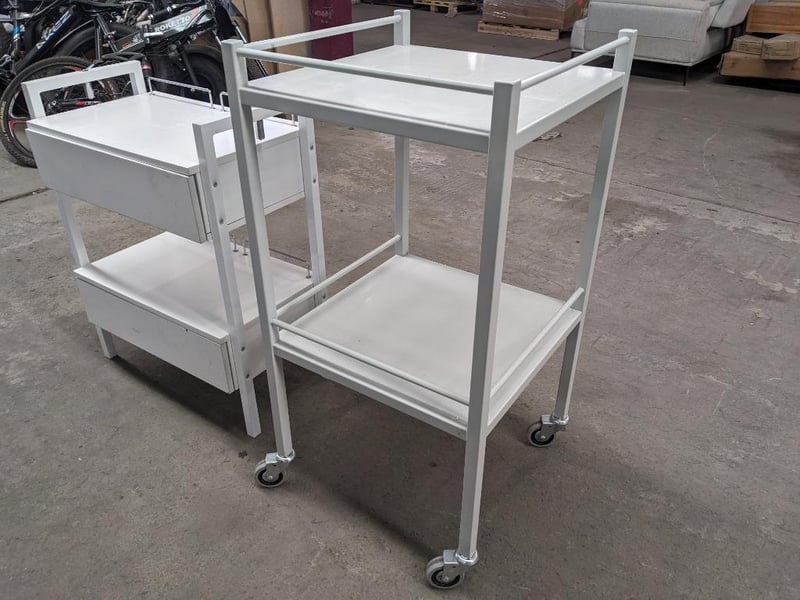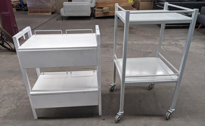 Side Table Lot, Steel and Timber, 1 Mobile, White, 2 TierDimensions: 79cm x 63cm x 36cm96cm x 49cm x 49cmNote Signs of WearSold as lot