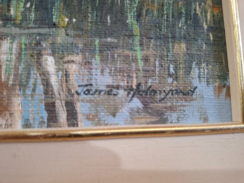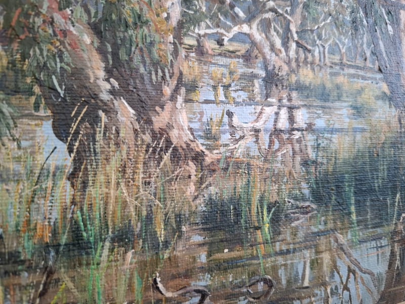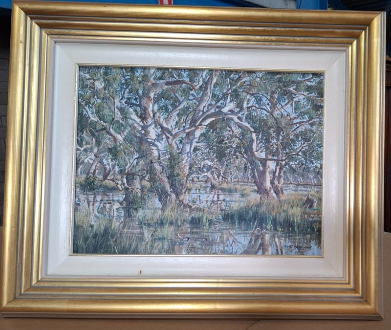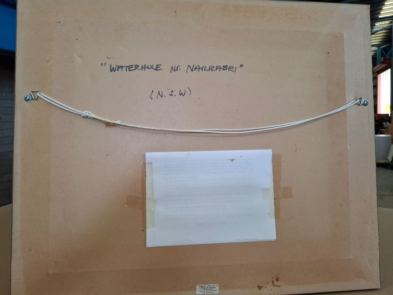 Oil on canvas artwork 31cm x 41cm , title : W aterhole Nr Narrabri " Autorn: James holmyard mounted on Golden frame 51cm 61 xm