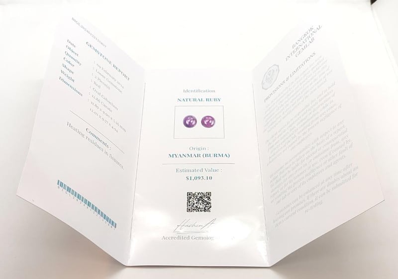 2 12.86CT MYANMAR NATURAL OVAL CABOCHON RUBIESClarity: Heating Residues In FissuresColour: RedFluorescence: N/ATotal Item Weight: 2.57gCondition: Fair - Refer To ImagesInsurance Replacement Valuation Amount: $1,093.10ACACIA RIDGE584449+16