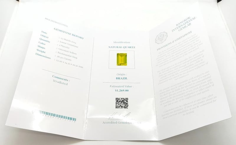 28.2CT GREENISH YELLOW BRAZILIAN RECTANGULAR STEP NATURAL QUARTZClarity: IrradiatedColour: Greenish YellowFluorescence: N/ATotal Item Weight: 5.63gCondition: Good - Refer To ImagesInsurance Replacement Valuation Amount: $1,269.00ACACIA RIDGE584449+17