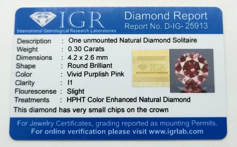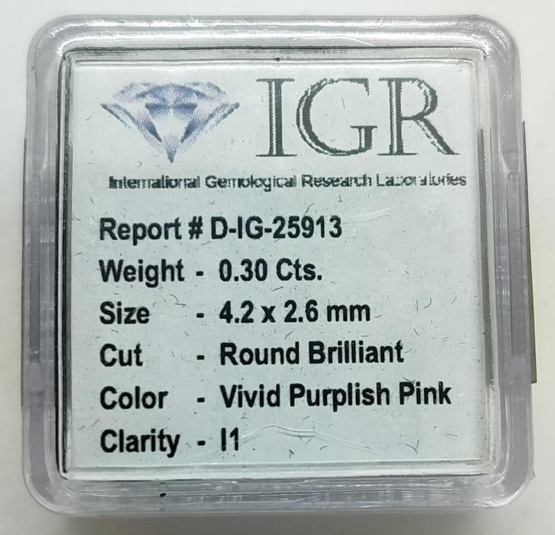 0.3CT ROUND BRILLIANT CUT NATURAL DIAMOND SOLITAIREClarity: I1Colour: Vivid Purplish PinkFlourescense: SlightCondition: Good - Refer To ImagesACACIA RIDGE584449+23