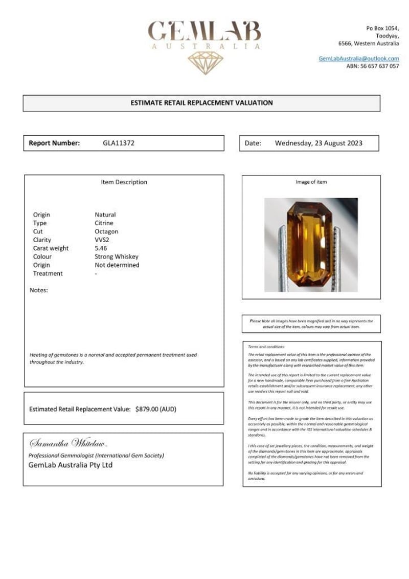 5.46CT CITRINEClarity: IncludedThis valuation has been conducted by an independent third-party professional. The valuation amount is an assessment by the issuing valuer and does not reflect the auction value of the item.Any inquiries regarding the valuation should be directed to the issuing valuer (refer to contact details on the certificate), as Lloyds Auctions has no affiliation or influence over the valuation, the valuer, or the stated amount.Insurance Replacement Valuation Amount: $879.00SR233603+19