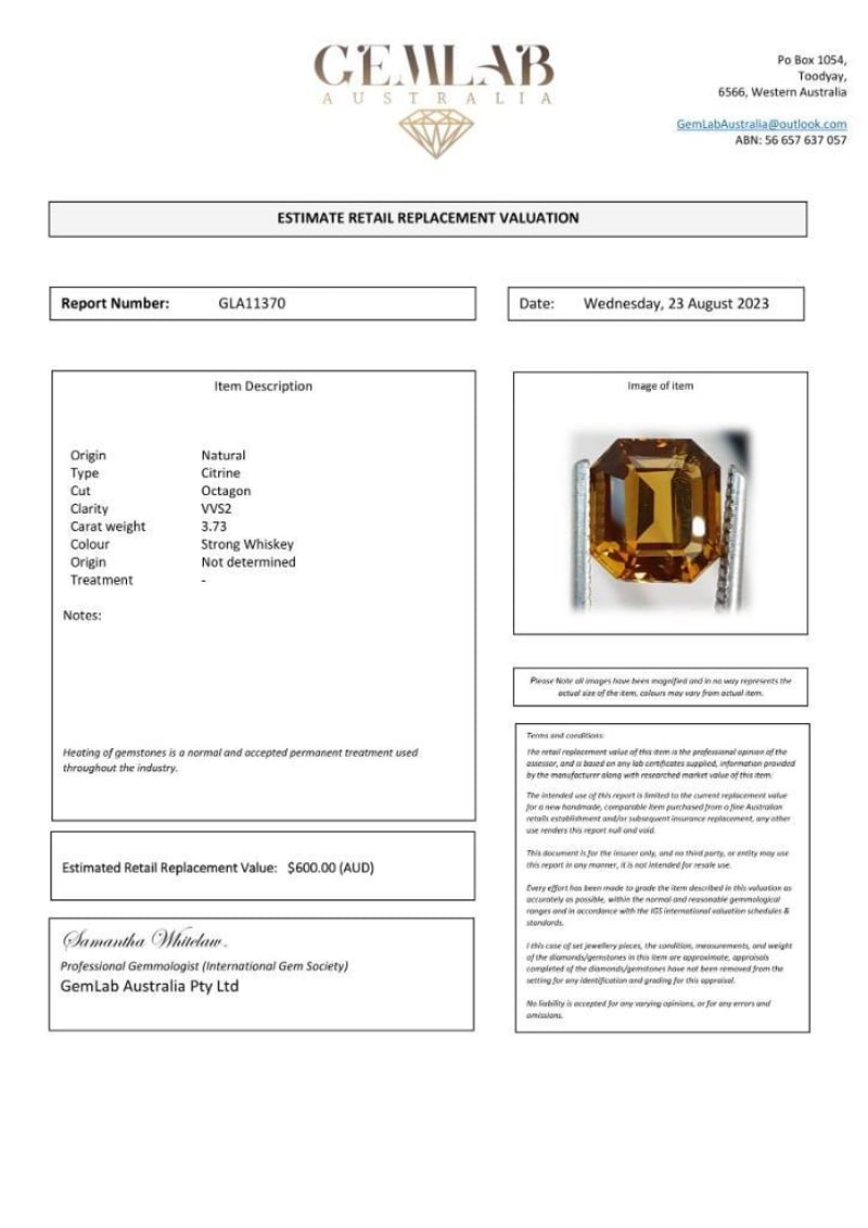 3.73CT CITRINEClarity: TransparentCondition: Good - Refer To ImagesThis valuation has been conducted by an independent third-party professional. The valuation amount is an assessment by the issuing valuer and does not reflect the auction value of the item.Any inquiries regarding the valuation should be directed to the issuing valuer (refer to contact details on the certificate), as Lloyds Auctions has no affiliation or influence over the valuation, the valuer, or the stated amount.Insurance Replacement Valuation Amount: $600.00SR233603+23