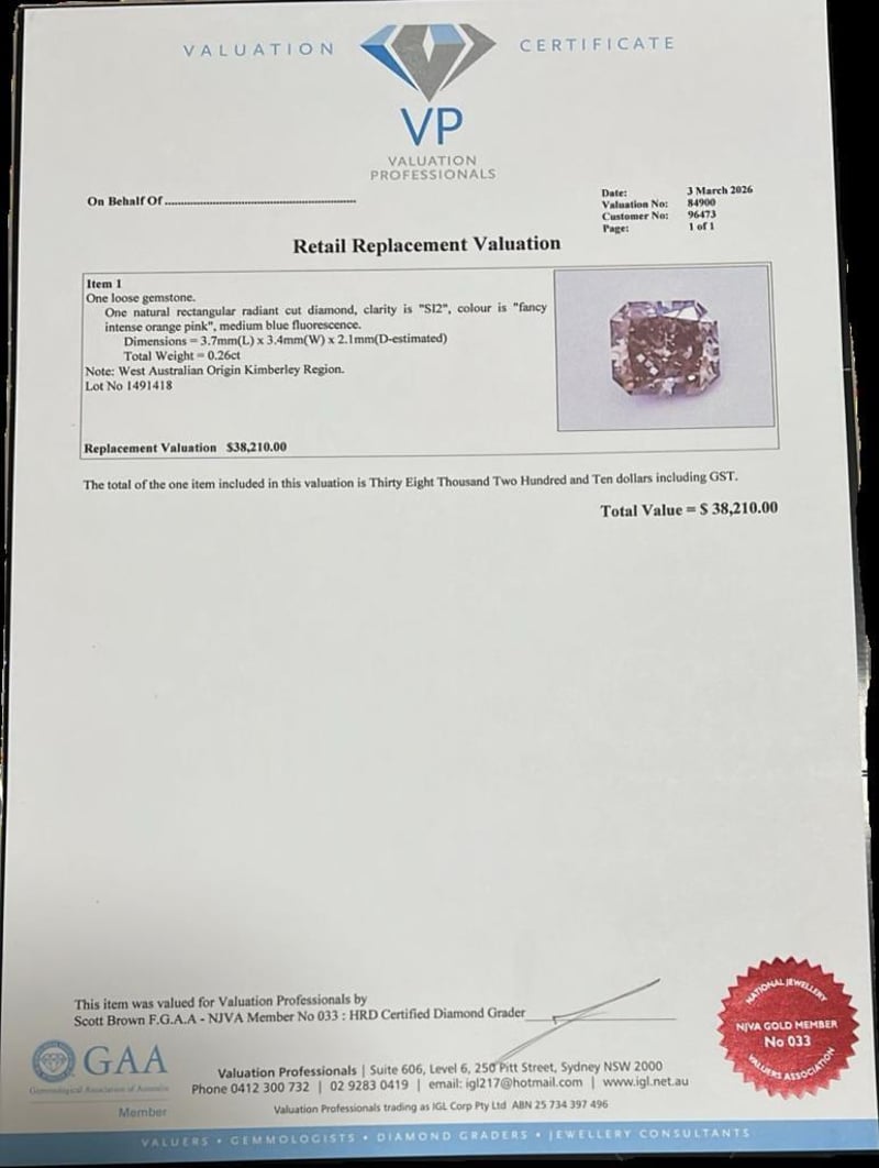 0.26 CARAT PINK RECTANGULAR RADIANT CUT ARGYLE ORIGIN DIAMOND S12 FANCY INTENSE ORANGE PINK RETAIL VAL: $38210 Valuations Provided by an Independent Third-Party Professional Not Directly Associated With Lloyds Auctions at AUD $38210This valuation has been conducted by an independent third-party professional. The valuation amount is an assessment by the issuing valuer and does not reflect the auction value of the item. Any inquiries regarding the valuation should be directed to the issuing valuer (refer to contact details on the certificate), as Lloyds Auctions has no affiliation or influence over the valuation, the valuer, or the stated amount. Condition: Good - Refer Images 0311185+13