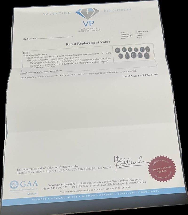 100.31 CARAT 11 ETHOPIAN OPALS WITH RETAIL VALUATIONS $12,037 Valuations Provided by an Independent Third-Party Professional Not Directly Associated With Lloyds Auctions at AUD $12037This valuation has been conducted by an independent third-party professional. The valuation amount is an assessment by the issuing valuer and does not reflect the auction value of the item. Any inquiries regarding the valuation should be directed to the issuing valuer (refer to contact details on the certificate), as Lloyds Auctions has no affiliation or influence over the valuation, the valuer, or the stated amount. Condition: Good - Refer Images 0311185+15