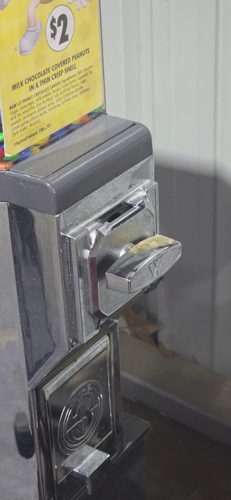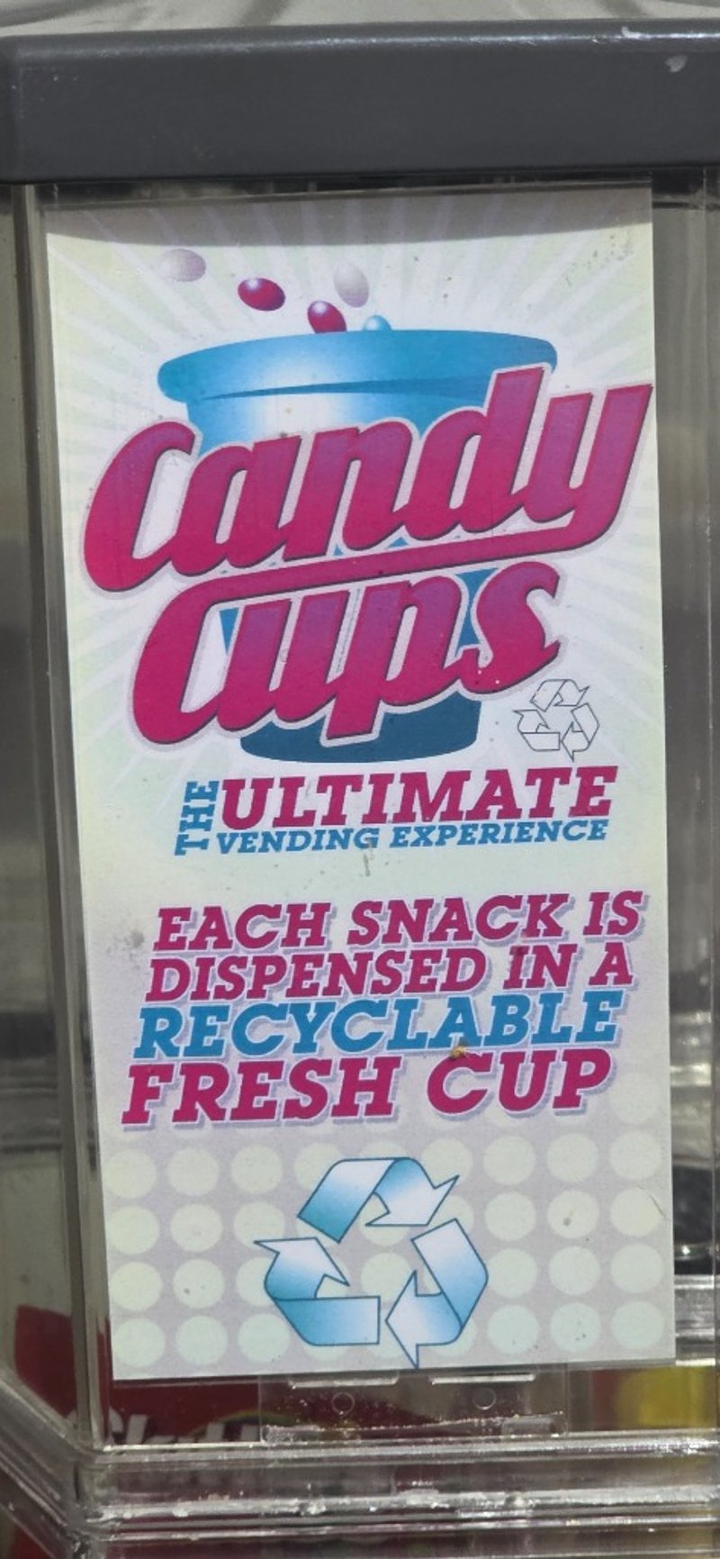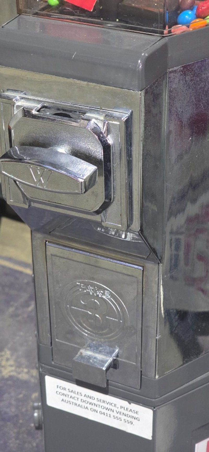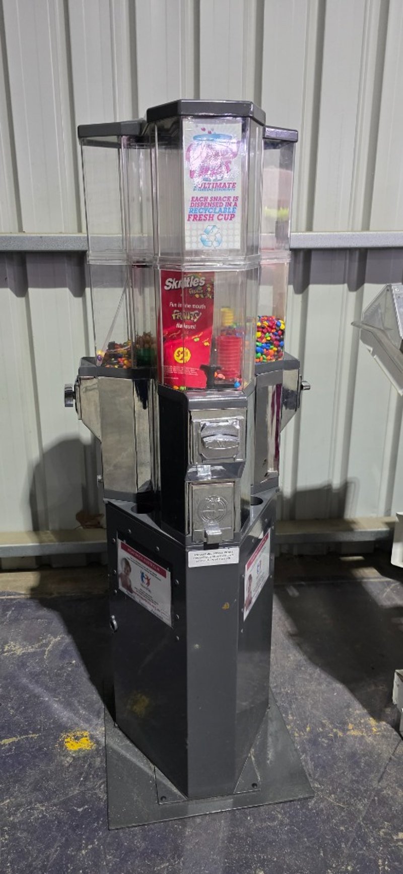 Dual-tier candy and snack vending machine by Walnut Group Inc. (Model 02108). Features three independently operating dispensing units stacked vertically. Upper tier displays "Candy Cups - The Ultimate Vending Experience" branding, dispenser priced at $2 AUD. Machine equipped with coin acceptors and mechanical vending mechanisms. Both tiers feature transparent acrylic viewing panels allowing full visibility of products. Black powder-coated steel base and framework