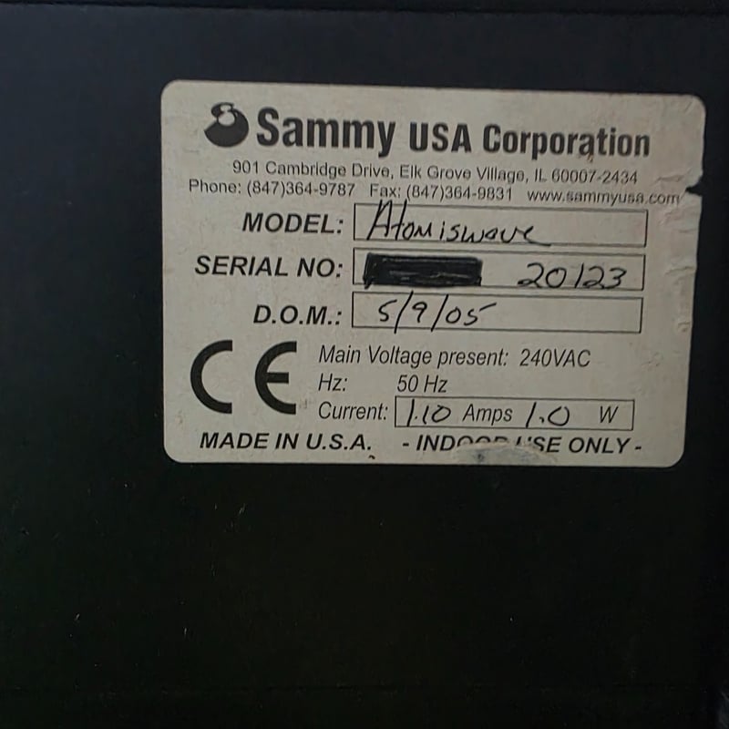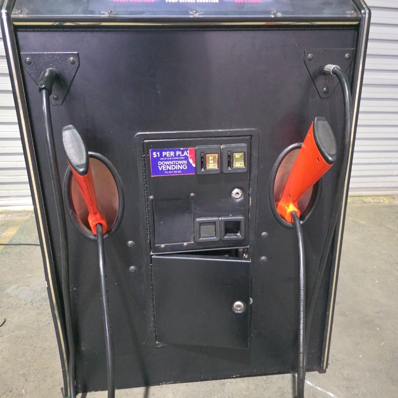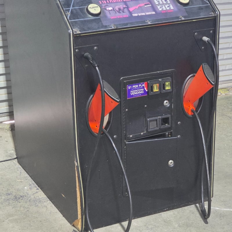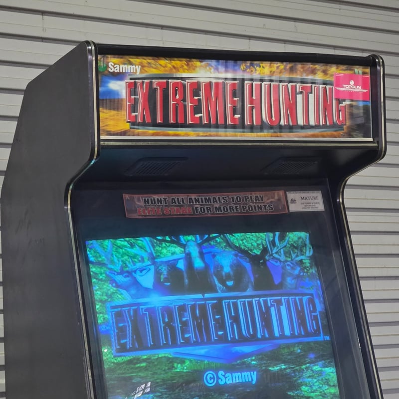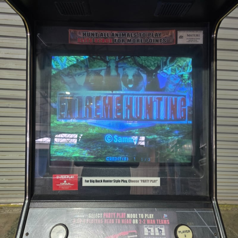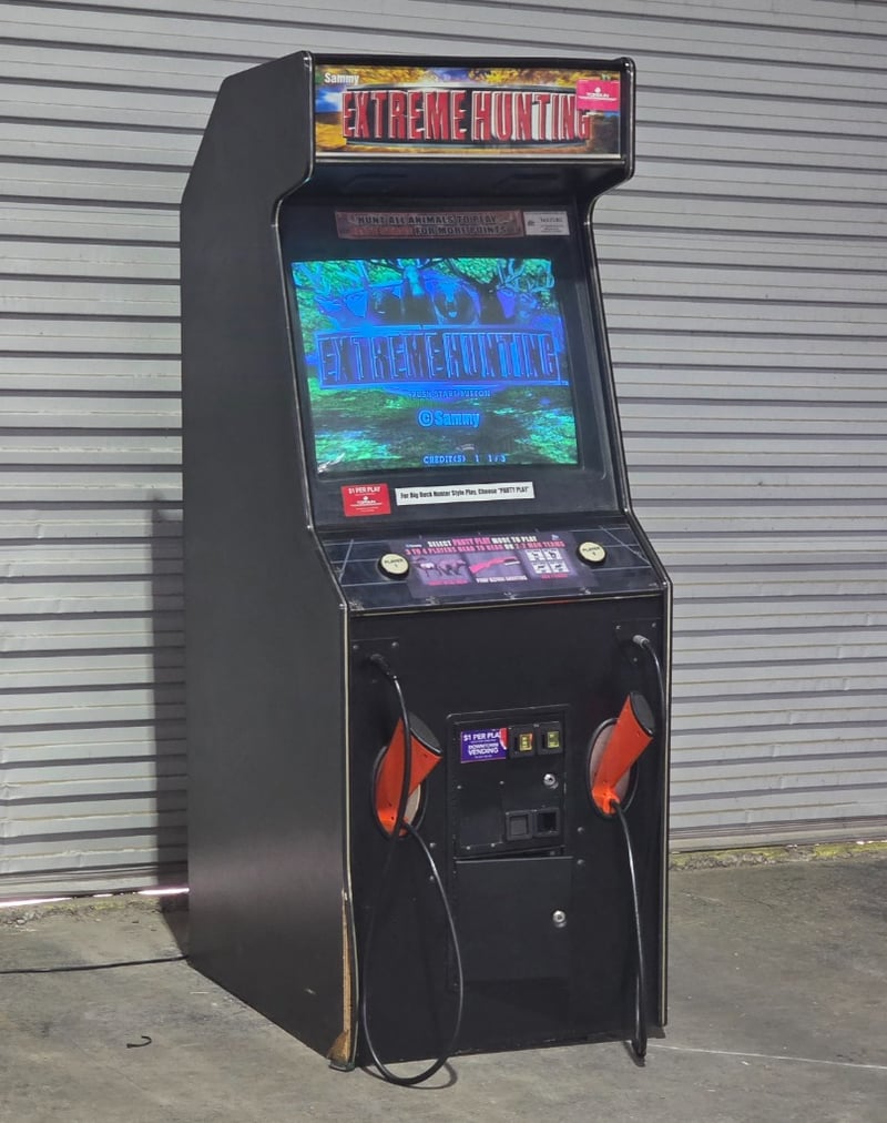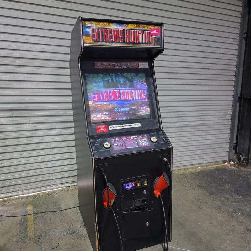 a light gun shooting game. Atom15wave model (Serial No. 20123, D.O.M. 05/09/05) manufactured by Sammy USA Corporation. Two-player cabinet with pump-action light gun controls and dual joystick buttons. Features CRT monitor displaying vibrant hunting gameplay graphics. Machine operates at 240VAC, 50Hz, 110 Amps. Playable in Party Play mode for 2 players in head-to-head or team competitions. Cabinet shows visible wear consistent with arcade use. Coin-operated at $1 per play. Equipped with red-trimmed light gun accessories and operational coin mechanisms