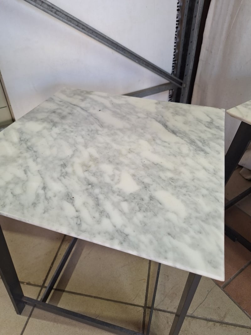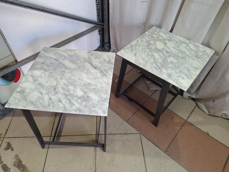 Pair Of Side Tables, Marble Style, White & Black Finish Dimensions H:46cm W:44cm D:44cm SOLD AS LOT