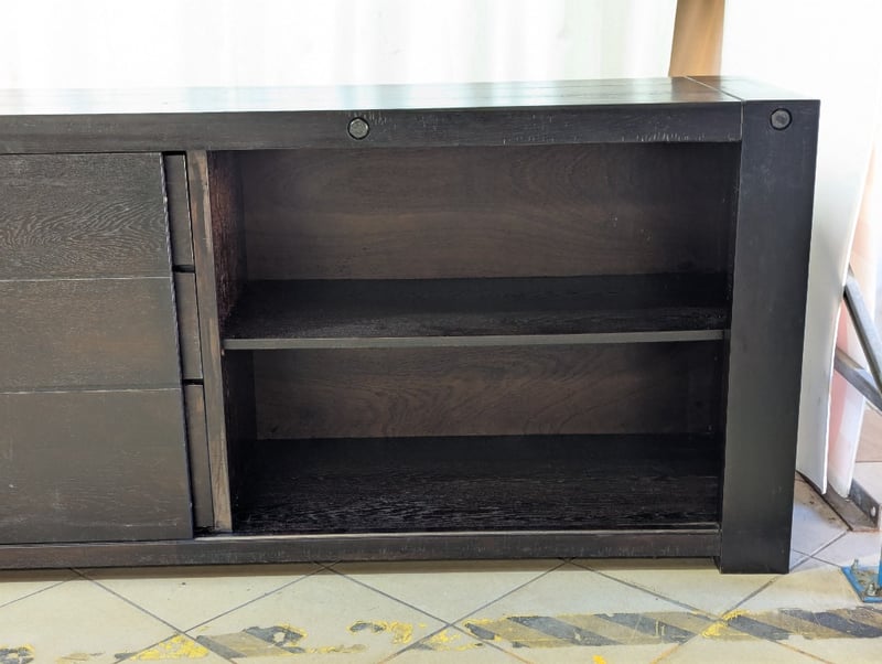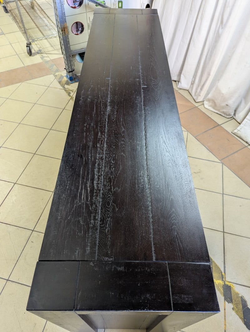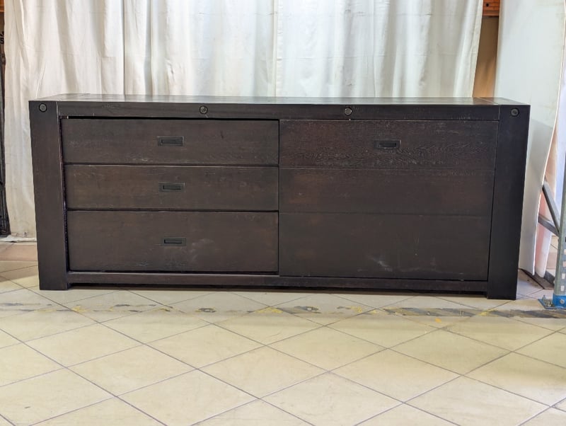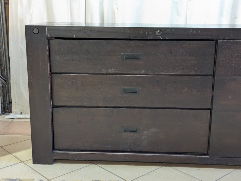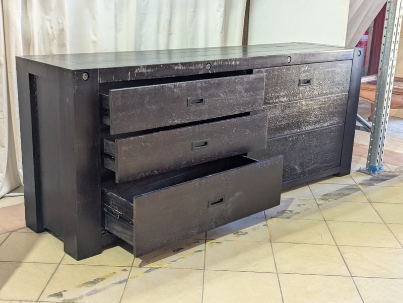 Dresser, timber, black finish, 3 drawers with a sliding door and 2 shelves Dimensions: H 80cm x W 199.5cm x D 48cm