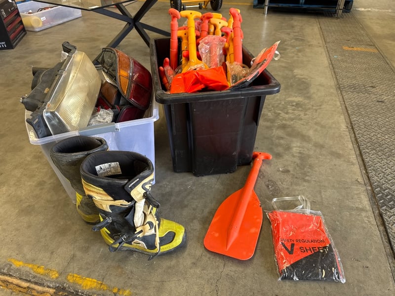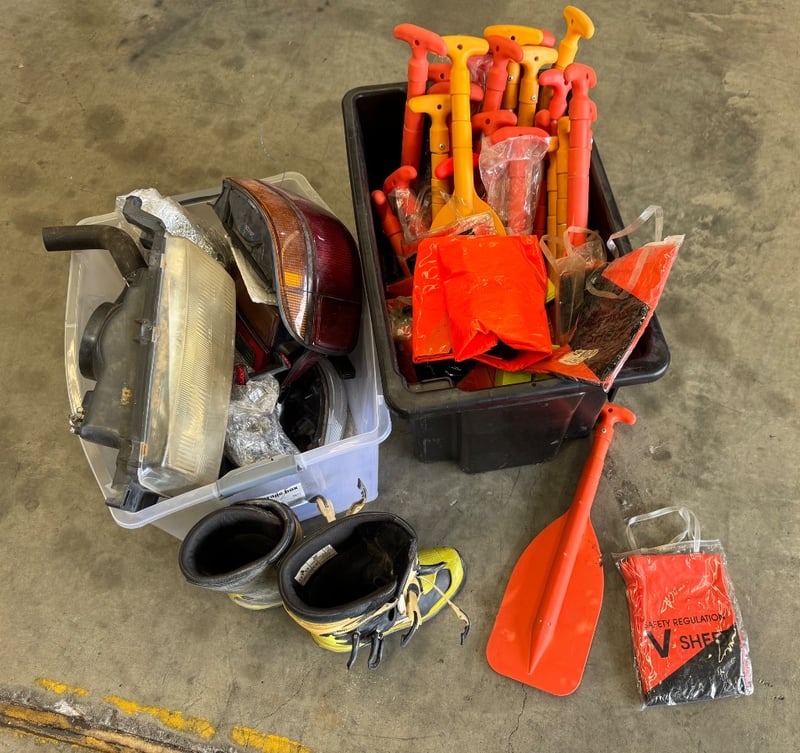 Assorted lot of sport and car equipment including paddles motocross boots size US 5 and safety regulation sheet and more Note: Sold as Lot