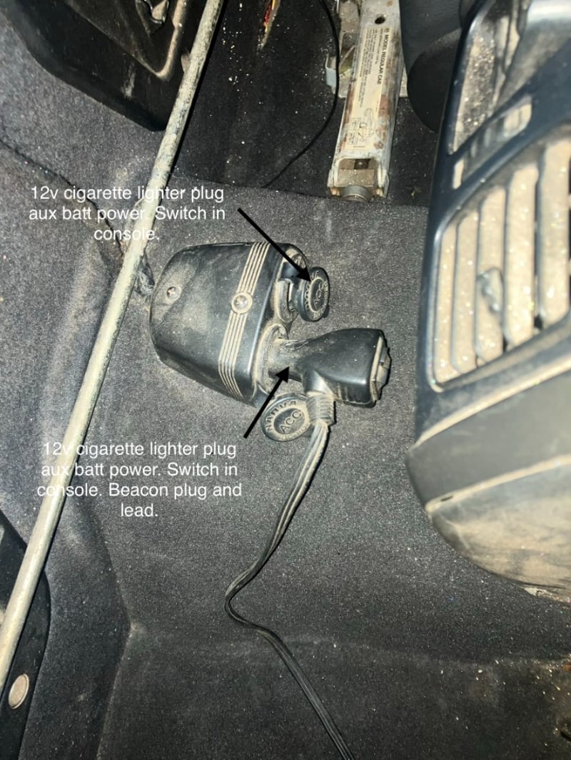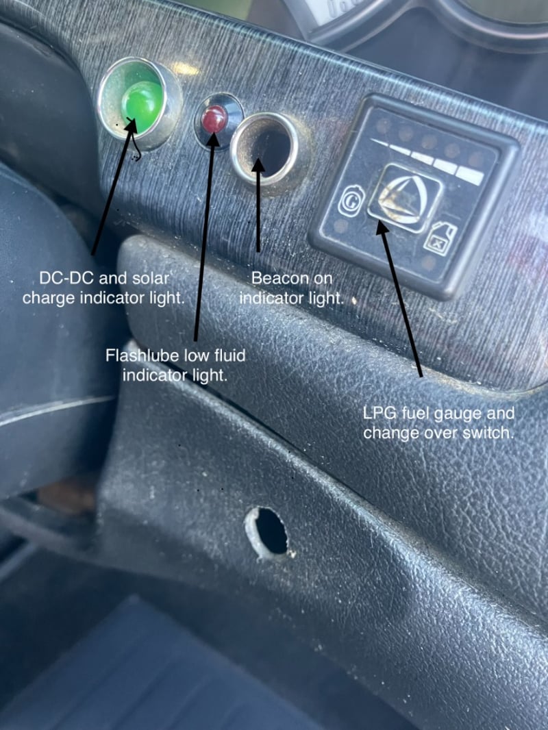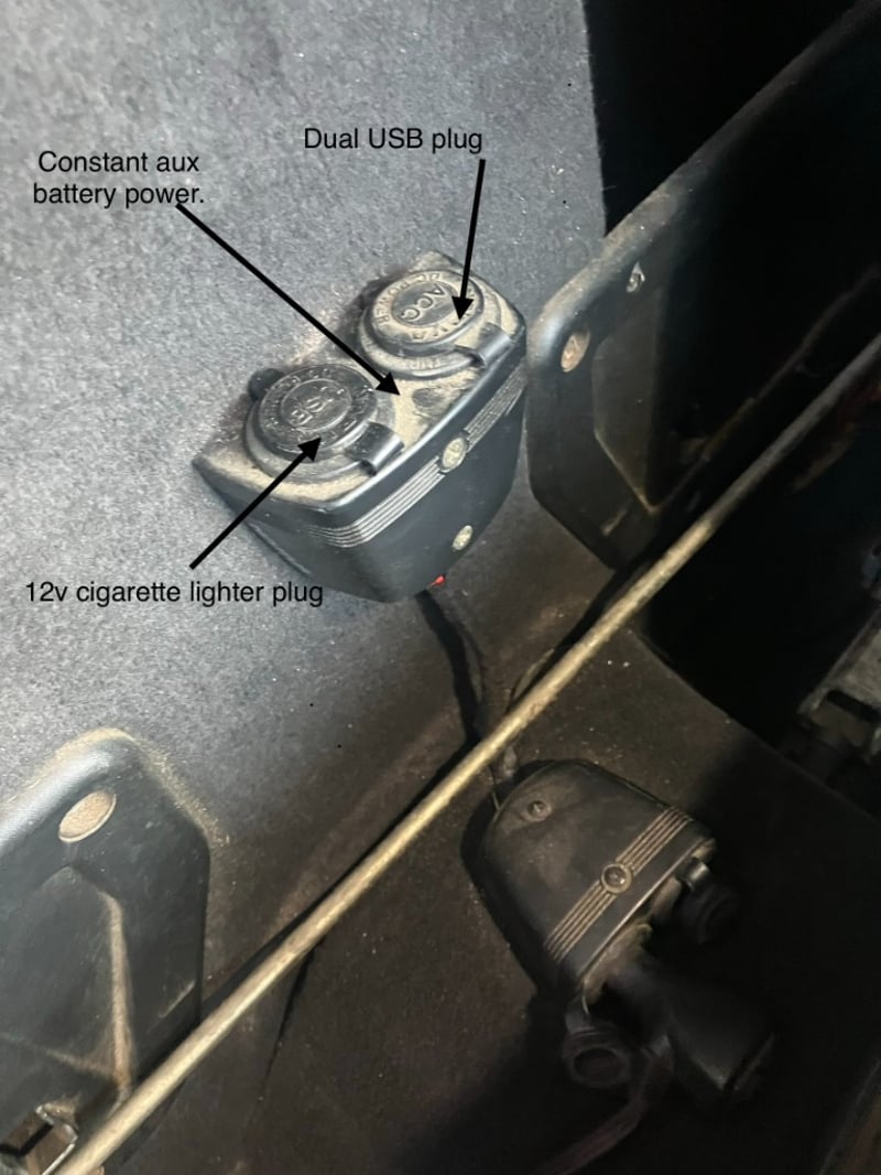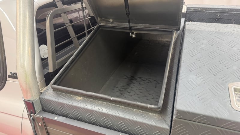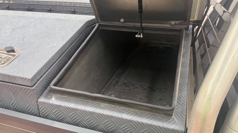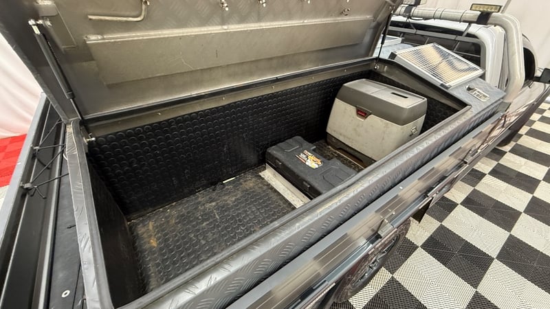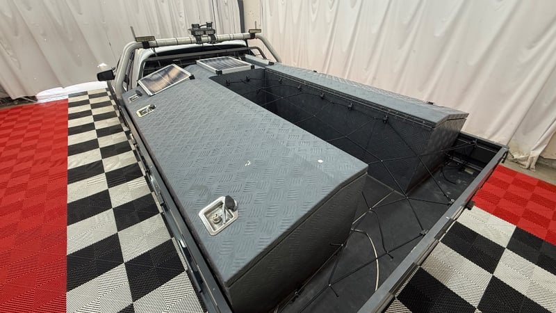 Auxiliary battery in front left under tray tool box with Projecta IDC25 DC-DC charger.
