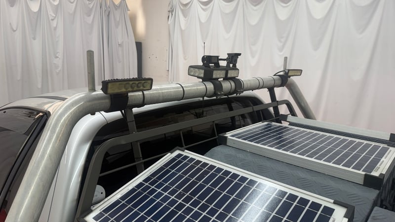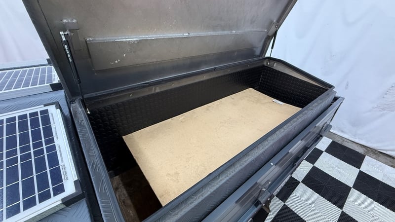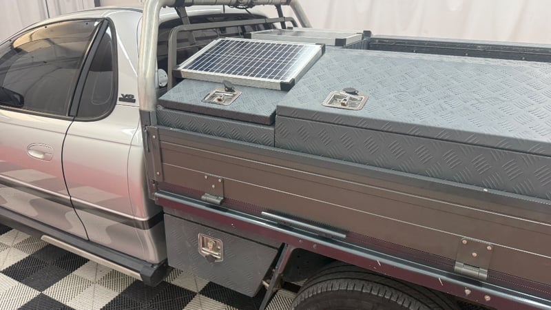 Gullwing toolbox with solar panels feeding auxiliary battery.