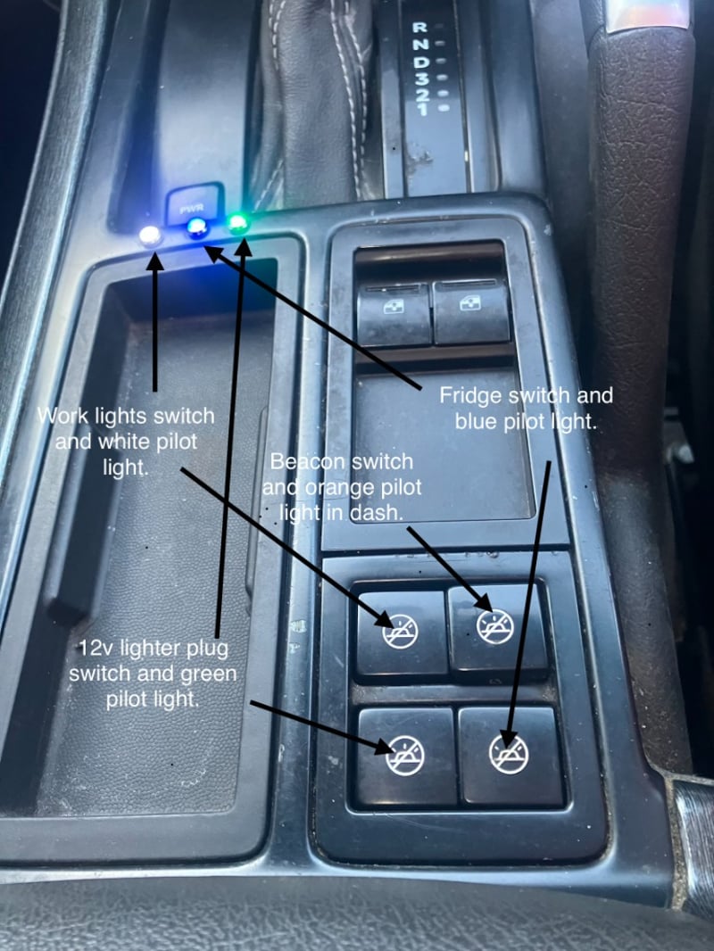 Engel 14L fridge in right hand tool box with internal console mounted switch and pilot light.