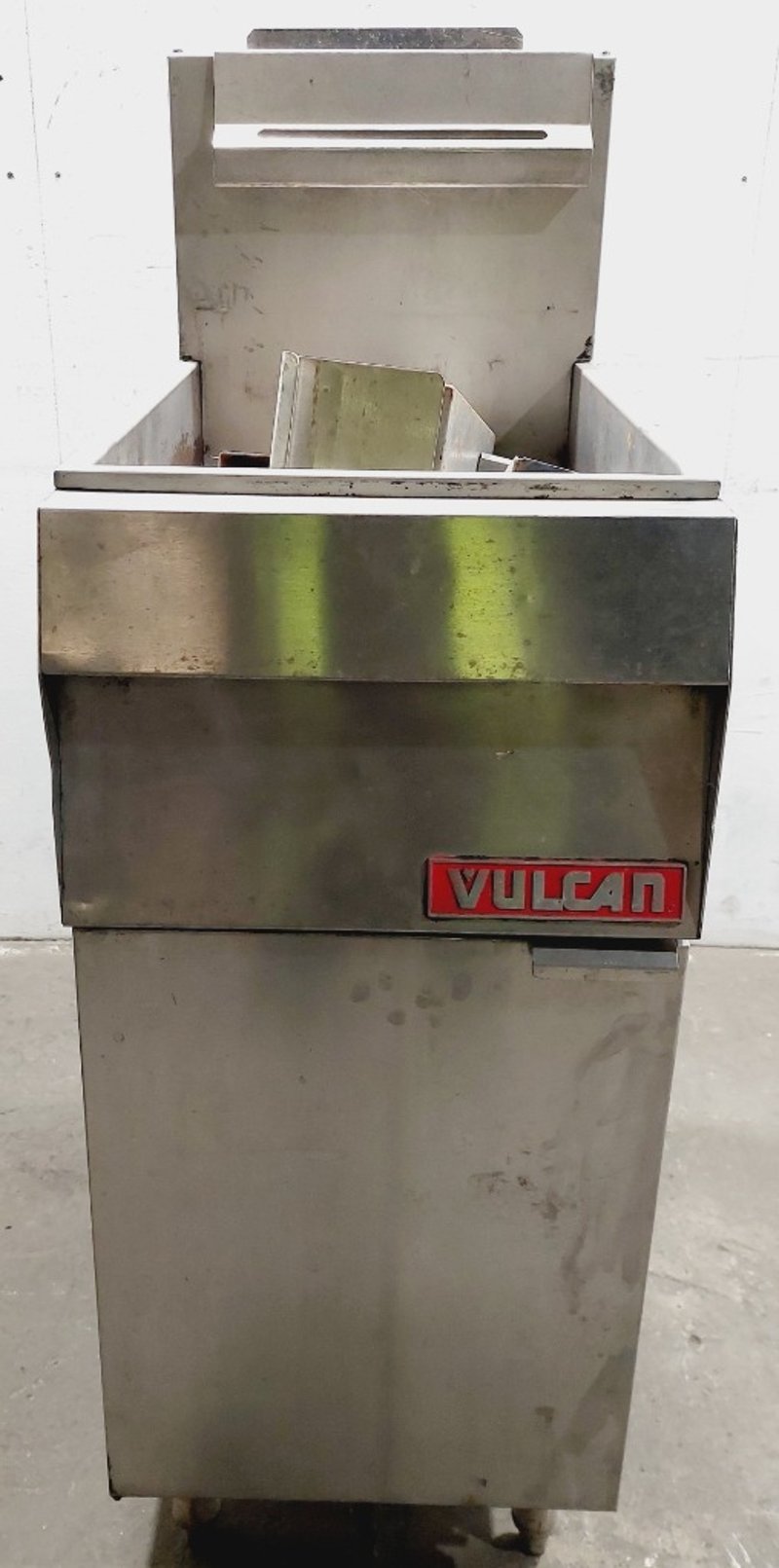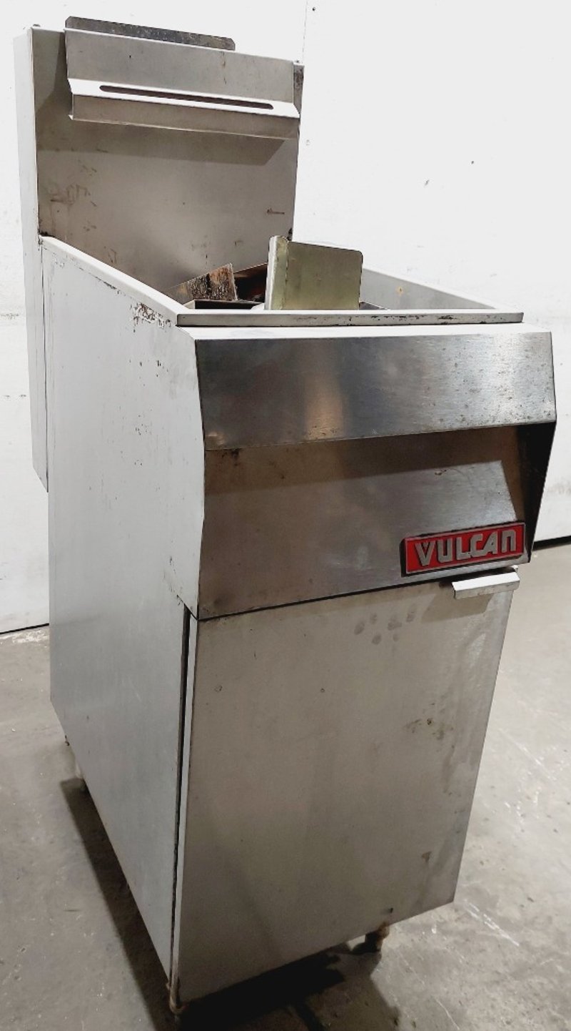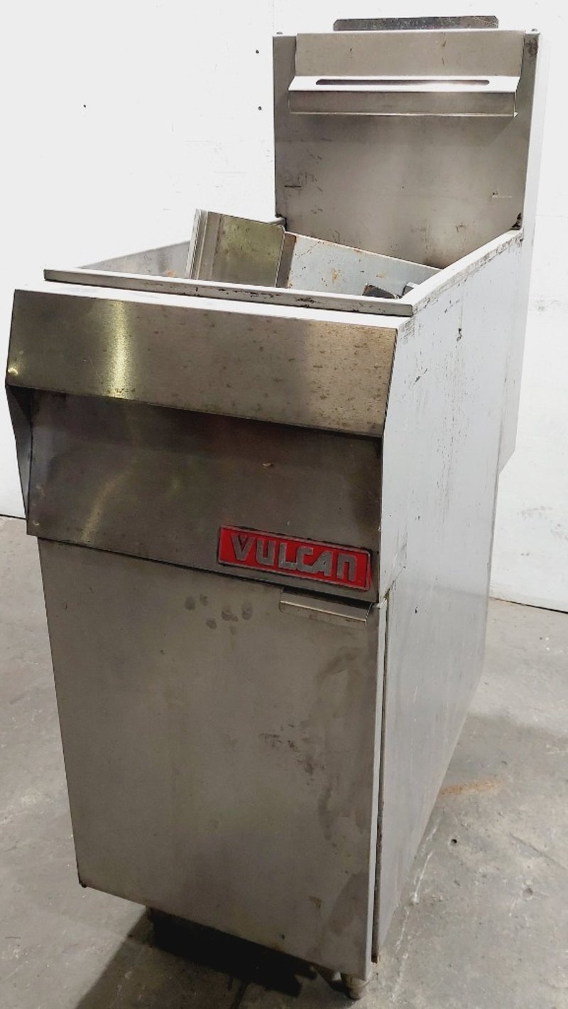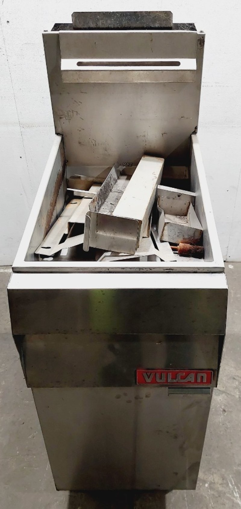 Vulcan Model TK35 commercial deep fryer, Heavy-duty construction featuring stainless steel fry tank, Internal components include burner assembly, control valve, and temperature management system. Unit mounted on casters for mobility. model TK35, serial number 48137419. Dimensions: untested, signs of wear