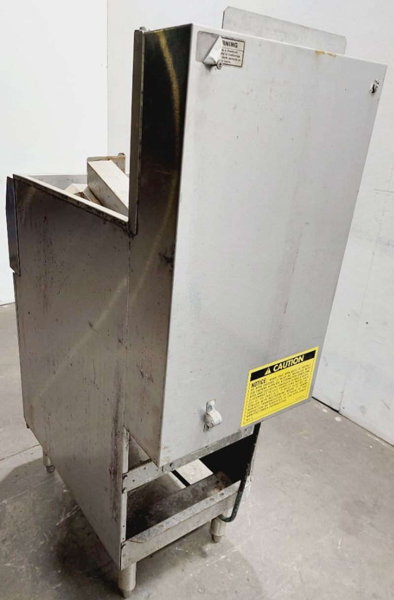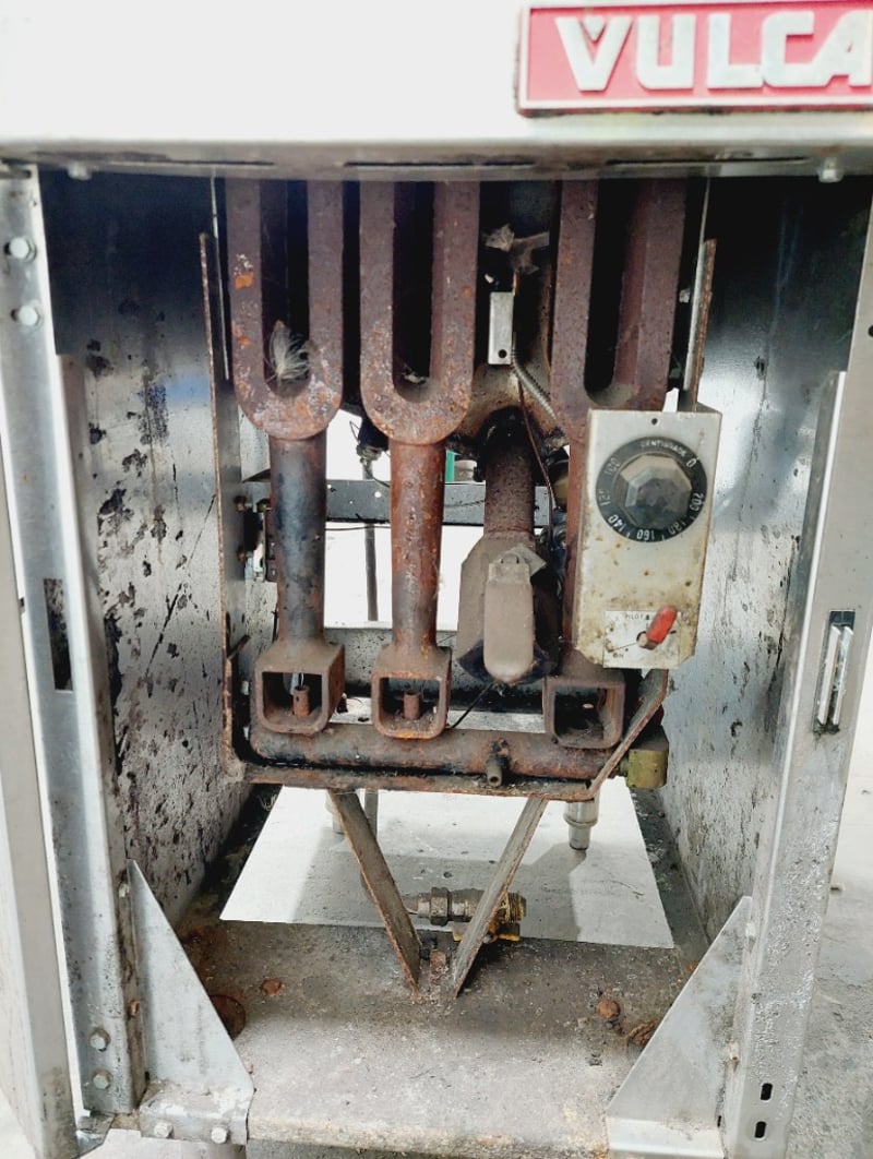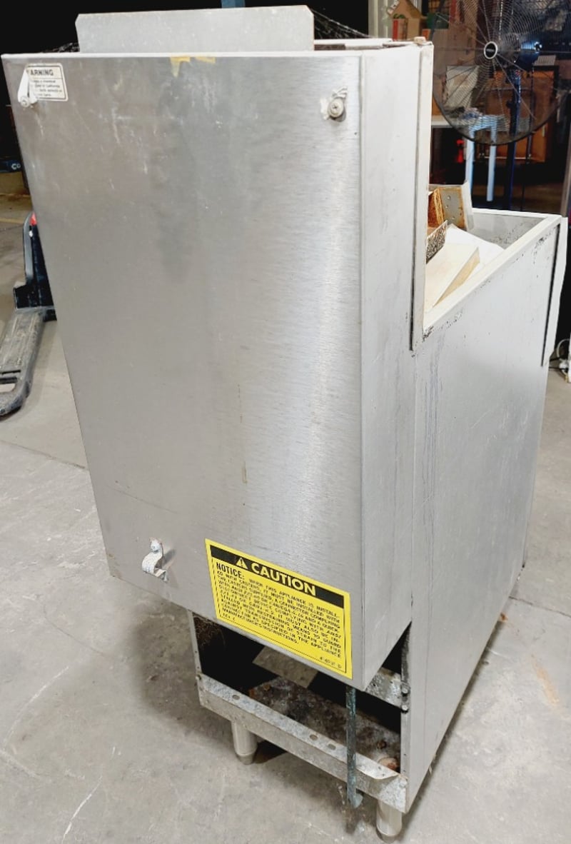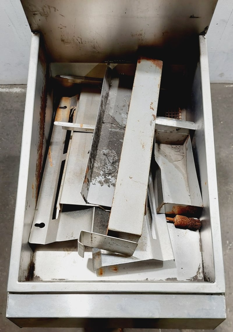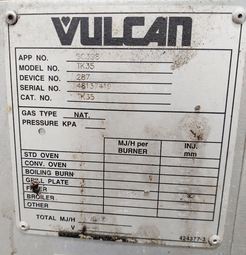 Vulcan Model TK35 commercial deep fryer, Heavy-duty construction featuring stainless steel fry tank, Internal components include burner assembly, control valve, and temperature management system. Unit mounted on casters for mobility. model TK35, serial number 48137419. Dimensions: untested, signs of wear
