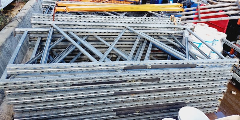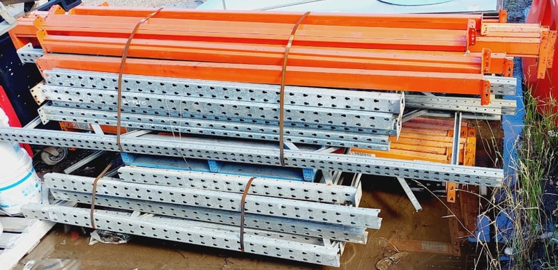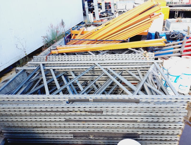 Pallet racking components. Aprox qty Vertical upright frames: 35 per lot Aprox qty horizontal load beams: 35 per lot