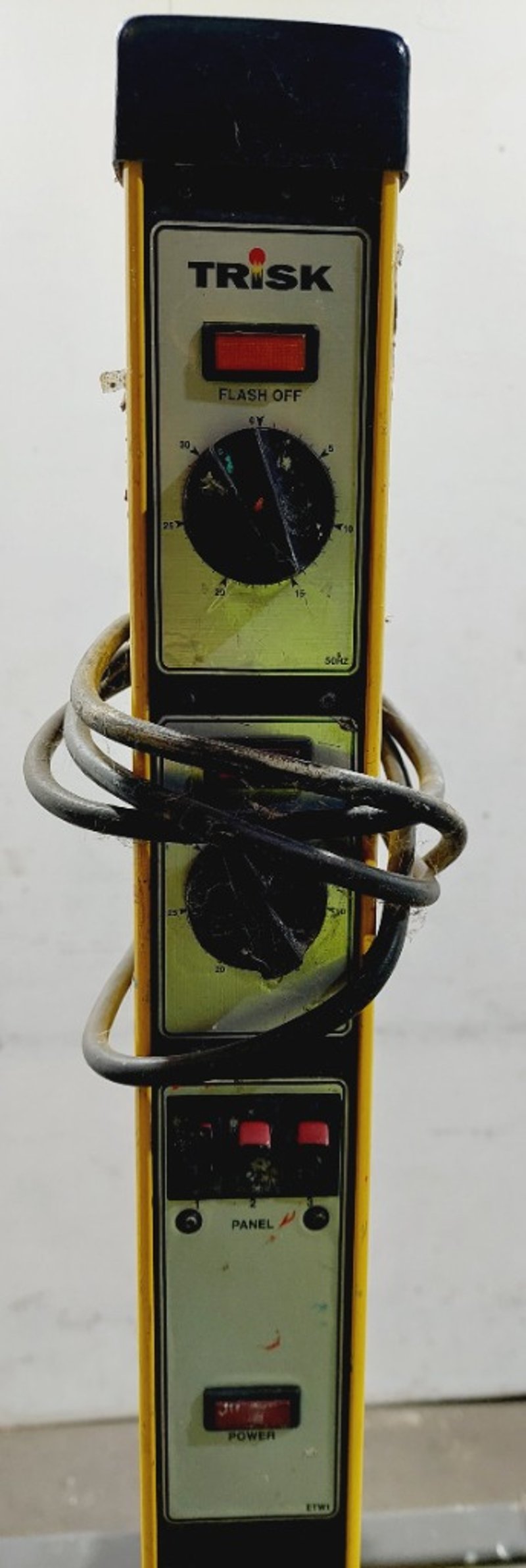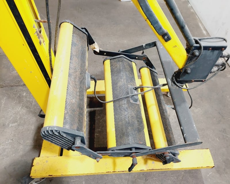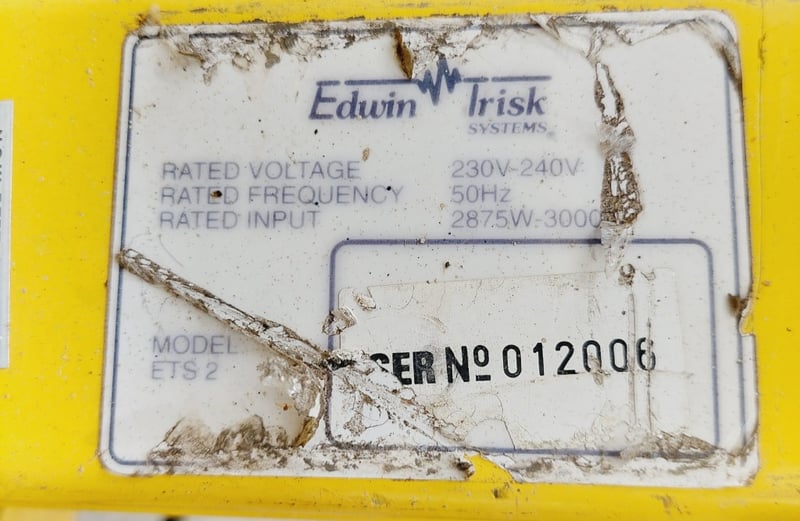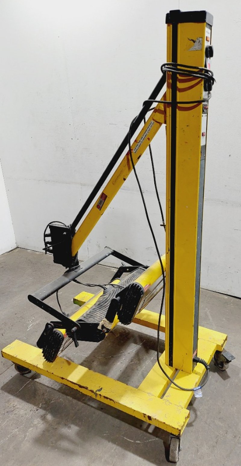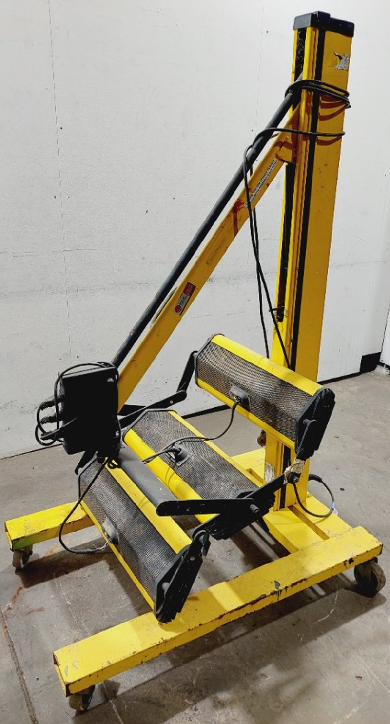 Edwin Trisk Systems ETS2 industrial stair climbing platform. Yellow and black heavy-duty construction with manual hydraulic operation,Mobile base with castors for transport. Designed for safe elevation and movement of materials on stairs. Serial number 012006.Note: untested, signs of wear