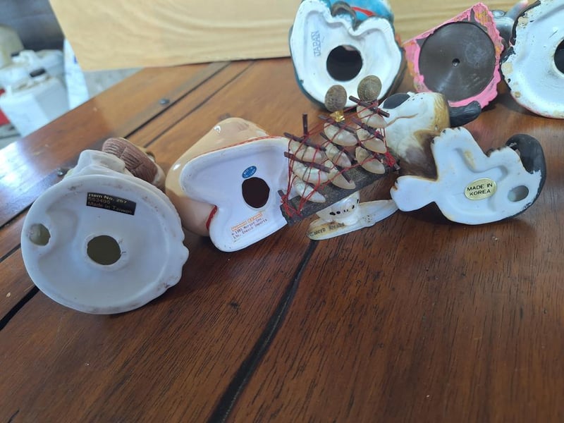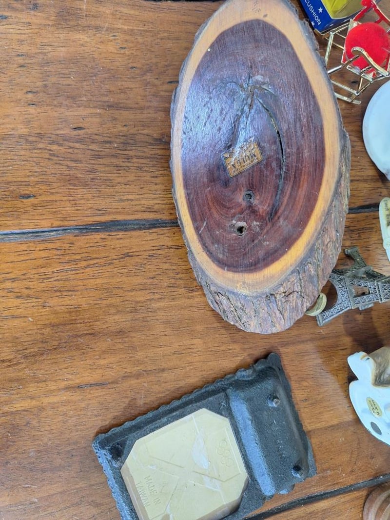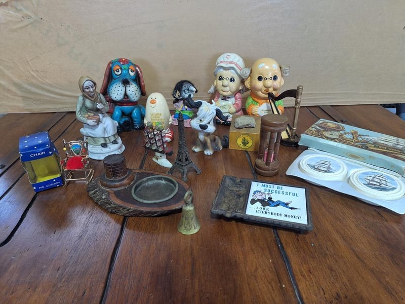 Includes: Ceremic Old Woman With Vegetable Basket, Human Bean By Enesco, Avon Clipper Ship Soap Set, 2 Retirement Fund Ceremic Money Box, Wood Sandglass Timer (Has A Chip In The Wood).
