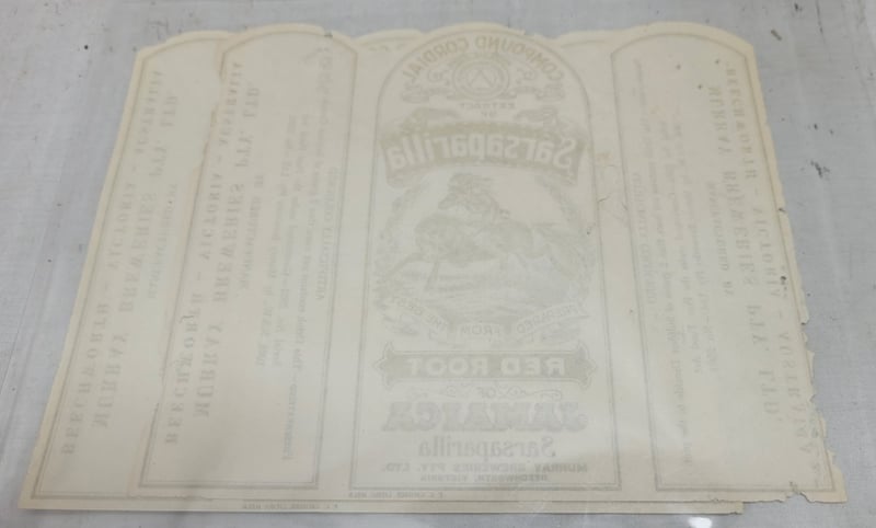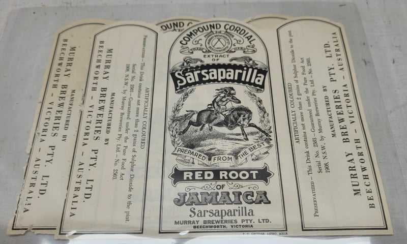 COLLECTIBLE AUSTRALIAN PAPER LABEL SARSAPARILLA Compound Cordial Sarsaparilla From Murray Breweries Pty, Ltd Based In Beechworth, Victoria, Australia Condition: Good - Refer To Images 587919+4