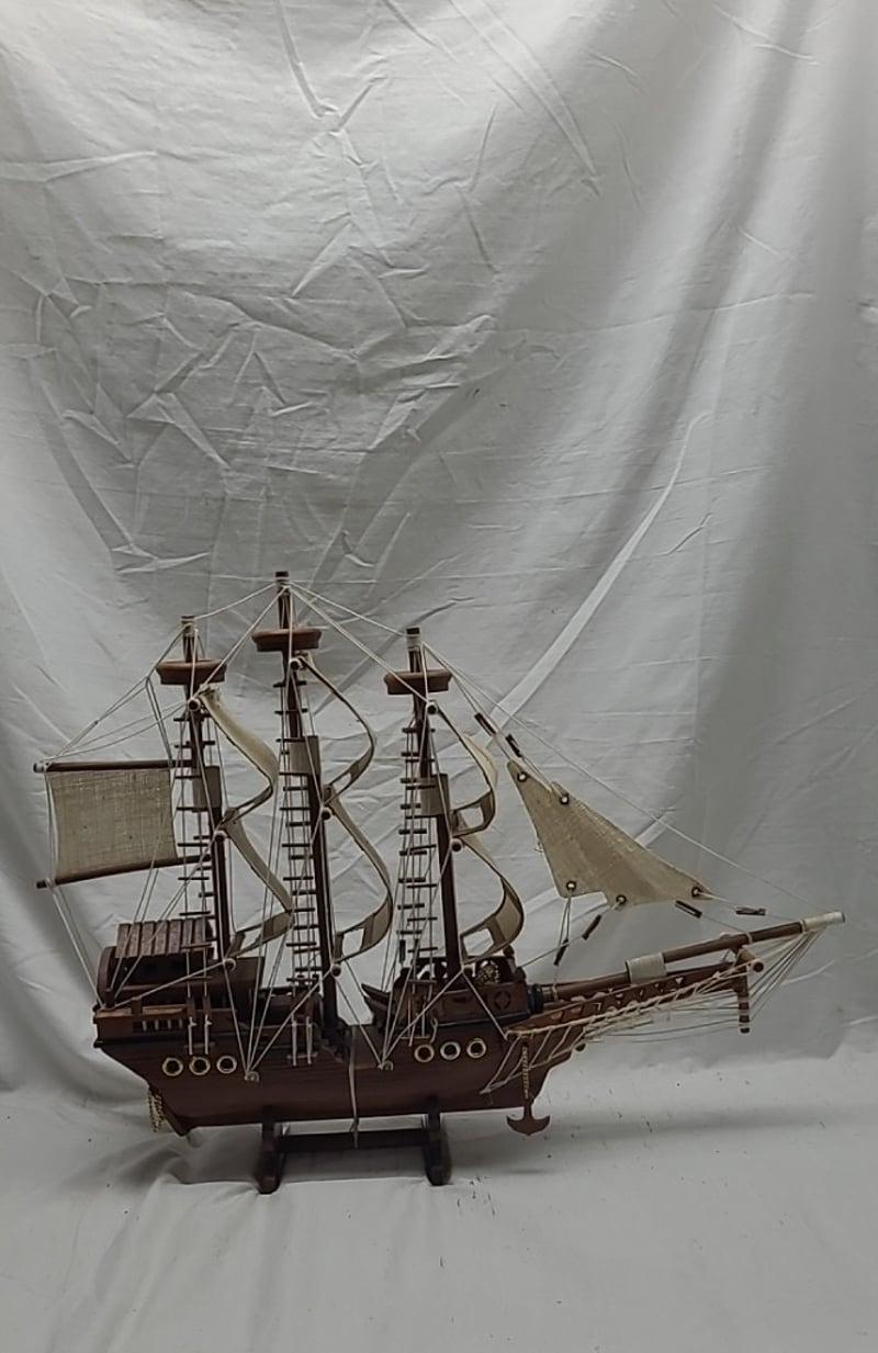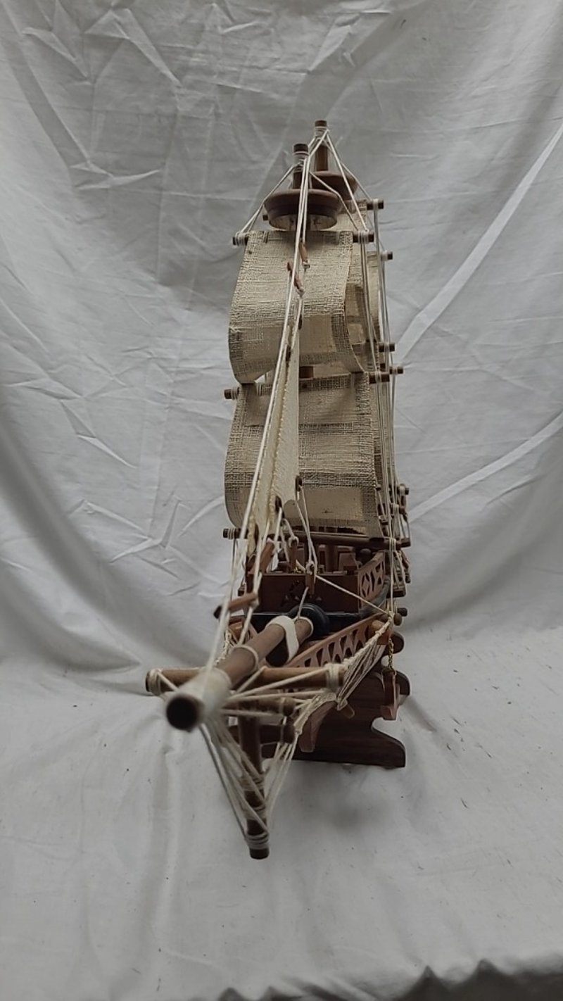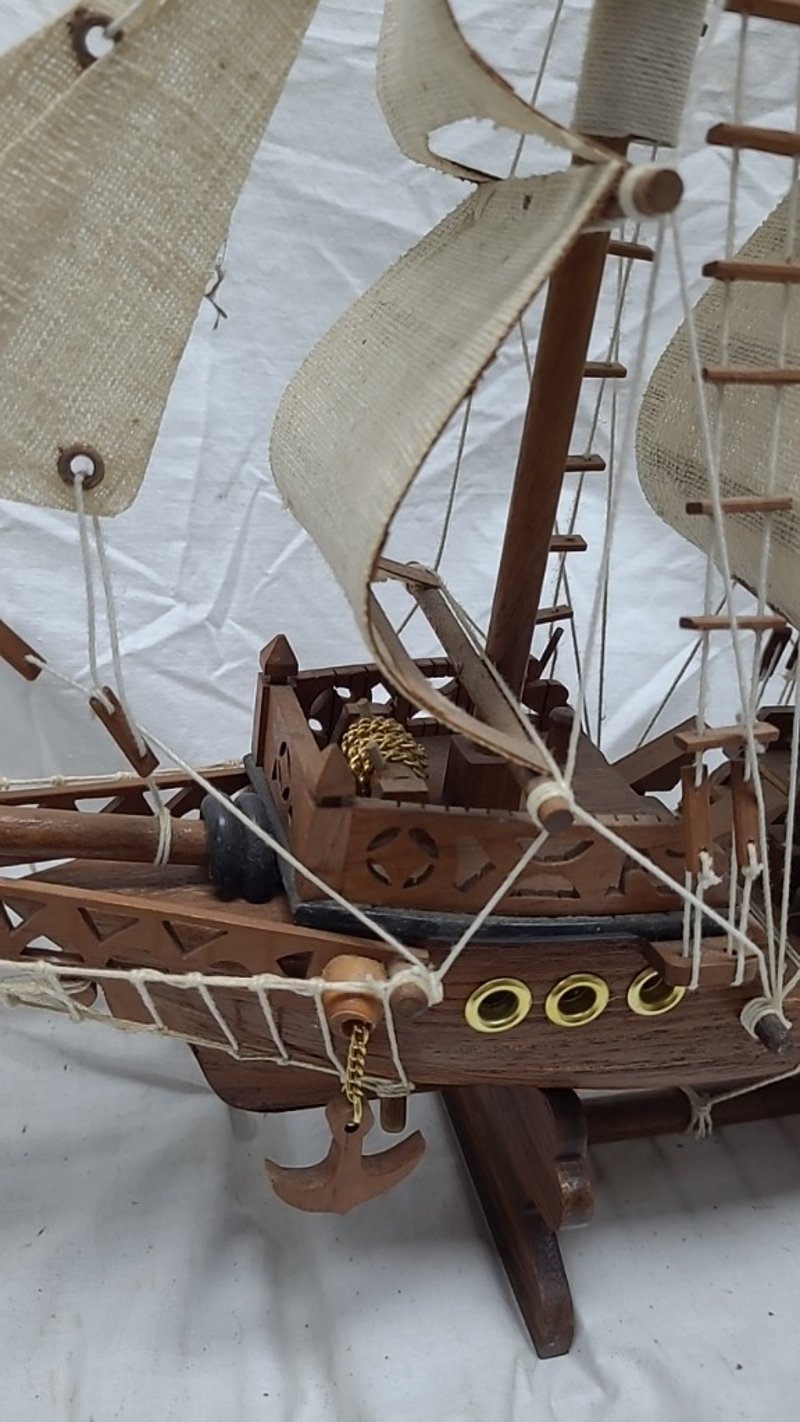 HANDICRAFTED WOODEN MODEL PIRATE SHIP. Item Size: Height: 42cm, Width: 55cm, Depth: 11cm Condition: Good - Refer To Images 587911+2