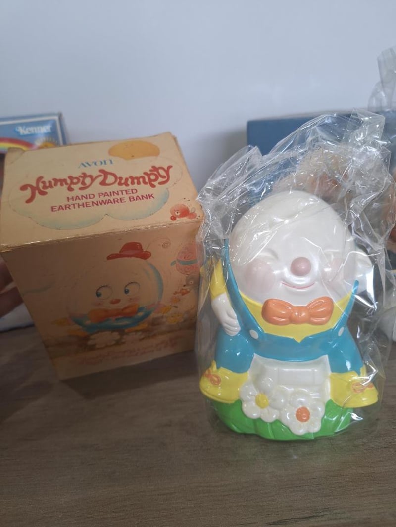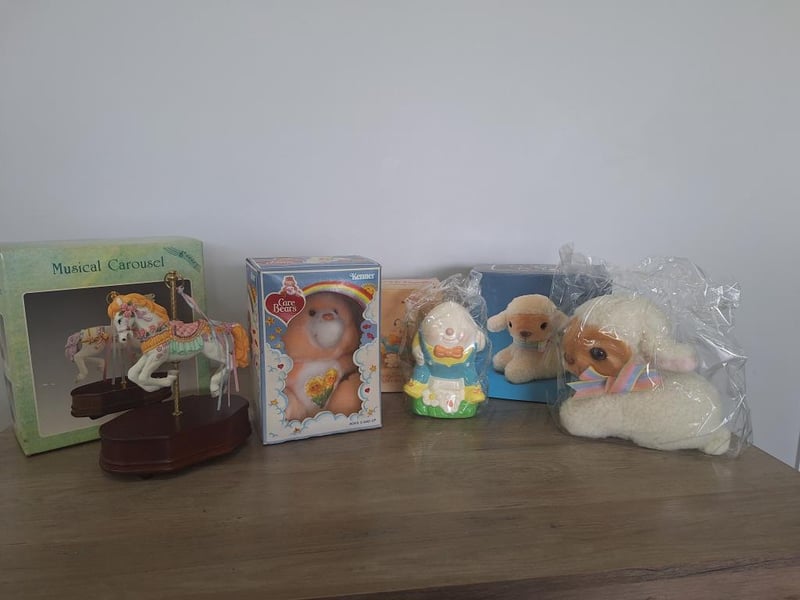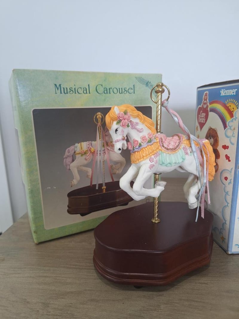 VINTAGE KIDS ITEMSKids Items: Musical Carousel Horse, Vintage Care Bear 'Kenner' Still In Original Packaging, Vintage Avon Humpty Dumpty Hand Painted Eartenware Coin Bank, Vintage Avo Plush Lamb Coin Bank Still In Original Packaging. Size: 24L x 25W x 35H cmCondition: Good - Refer Images584496+17