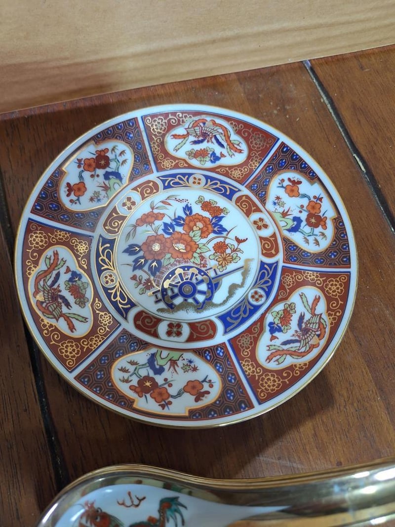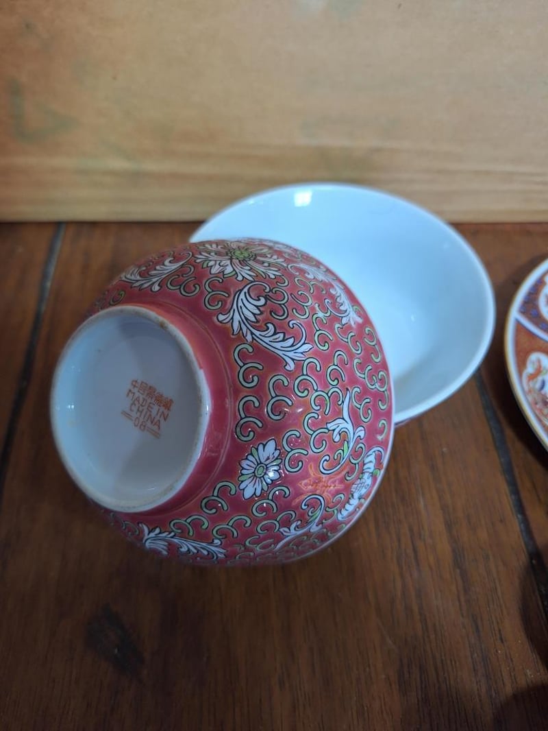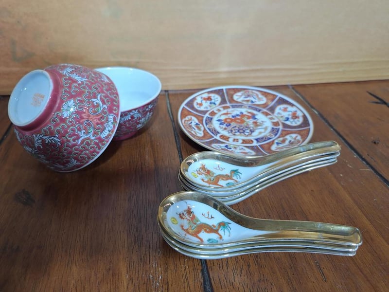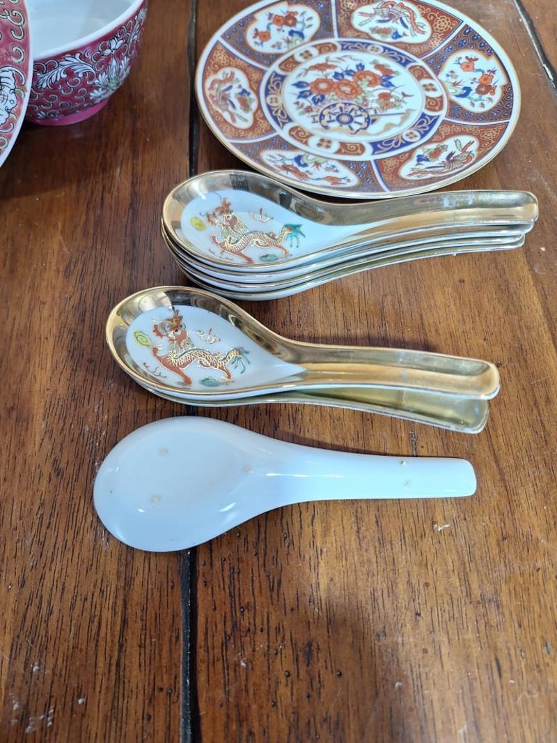 ASIAN VINTAGE ITEMS1 Japanese Imari Style Decorative Plate Blue Gold And Orange Design, 2X Chinese Pink Lotus Rice Bowls And 7X Soup Spoons With Red Dragon Chasing A Flaming Pearl DesignSize: 25L x 20W x 15H cmCondition: Good - Refer Images584496+29