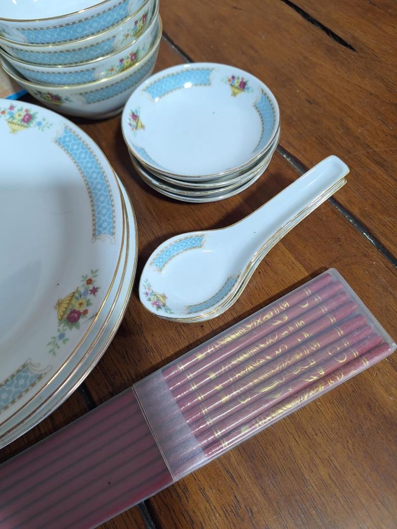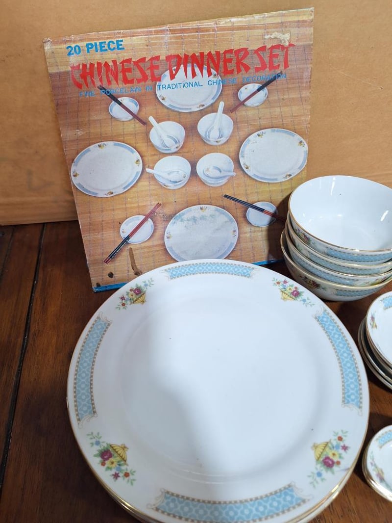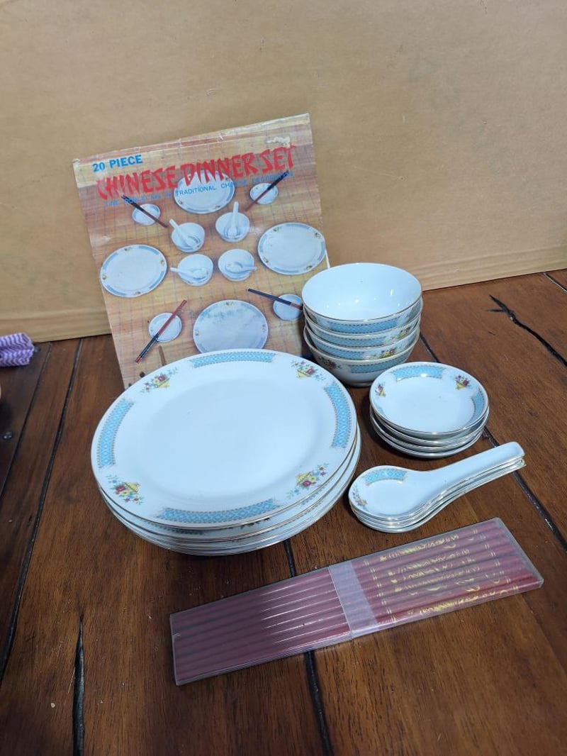 CHINESE 20 PIECE DINNER SETChinese 20 Piece Dinner Set: Fine Porcelain Chinese Set Including 4X Dinner Plates, 4X Side Plates, 4 Rice Bowls, 4 Sauce Bowls, 4X Soup Spoons And 4 Sets Of Chopsticks. Size: 50L x 30W x 15H cmCondition: Good - Refer Images584496+30