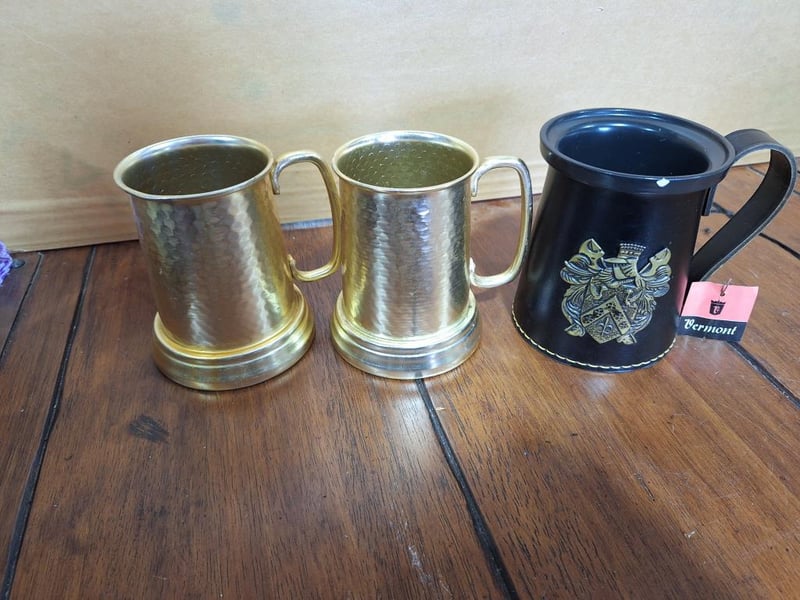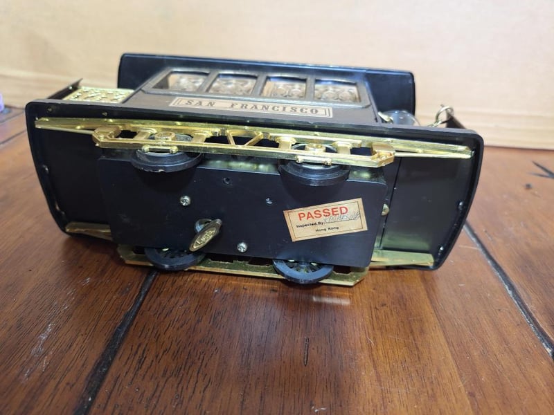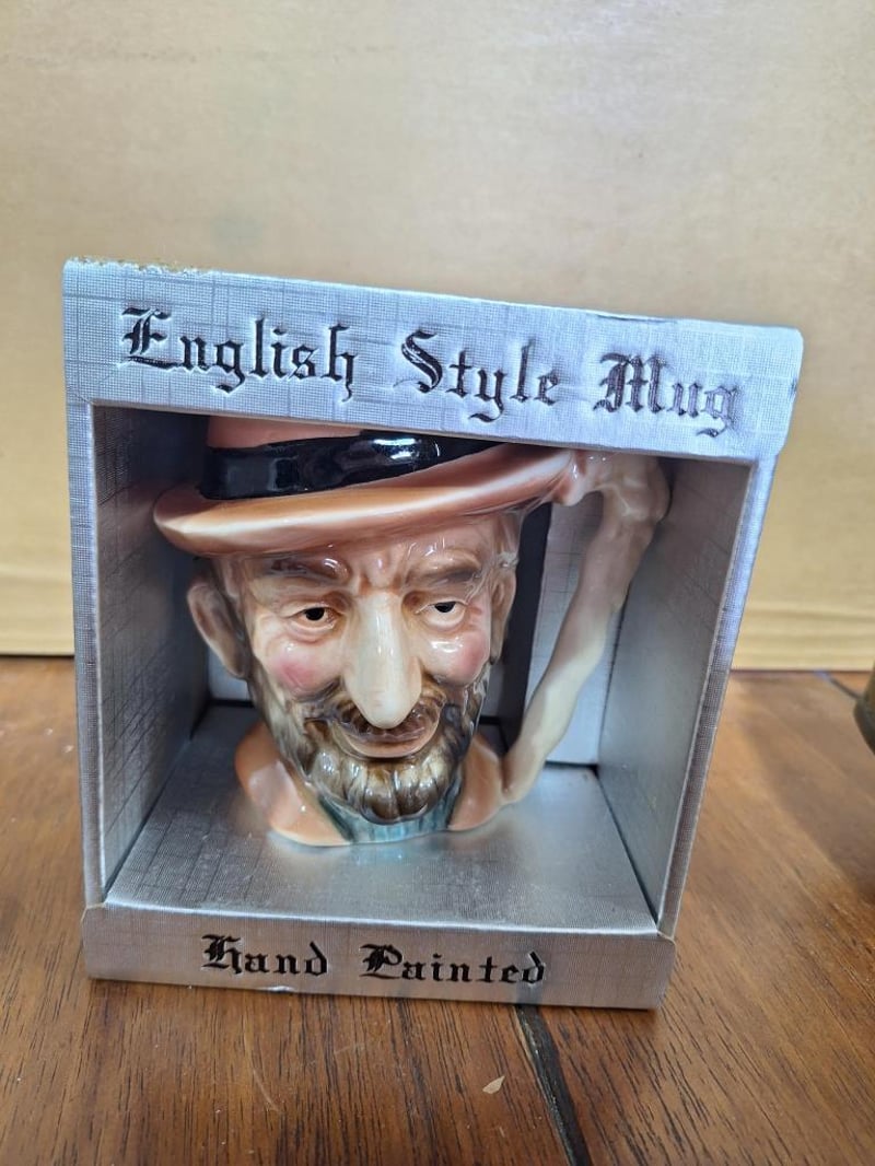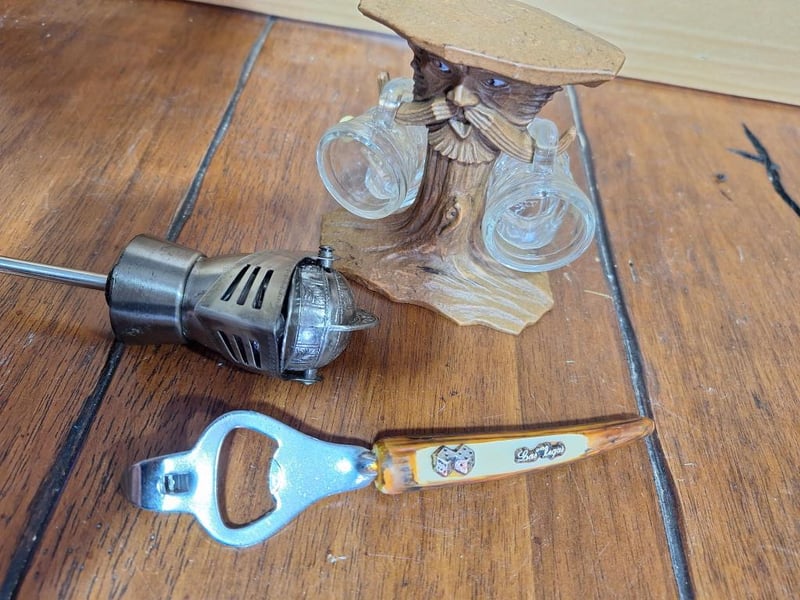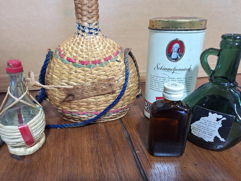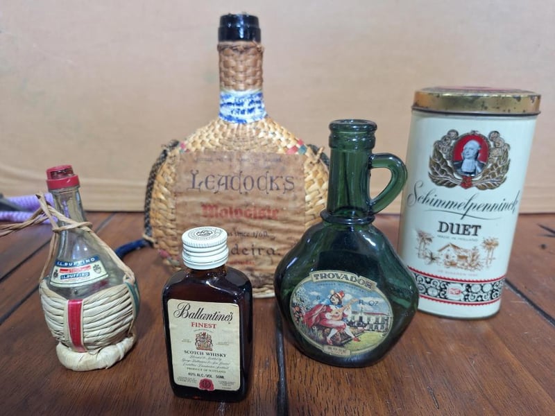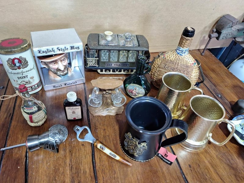 BAR SET OF ITEMSVintage Toby Head Jug, San Francisco Cable Car Decanter With 3 Shot Glasses And Plays Music, 1X Vermont Beer Stein With Faux Leather, Vintage Las Vegas Bottle Opener, Knight Helmet Bottle Pourer, Wooden Statue With 2 Boot Shot Glasses, 4Oz Green Glass Empty Bottle Of Trovador Rose Wine From Portugal, Liacocks Madeira Wine Bottle Encased In Woven Wicker, Ballantine'S Finest Blended Scotch Whisky Mini Bottle (Unopened), Empty I.L. Ruffino Chianti Wine Bottle With Wicker Basket Covering, Schimmelpenninck Duet Cigar Tin (Made In Holland). Size: 31L x 28W x 21H cmCondition: Fair - Refer Images584496+33