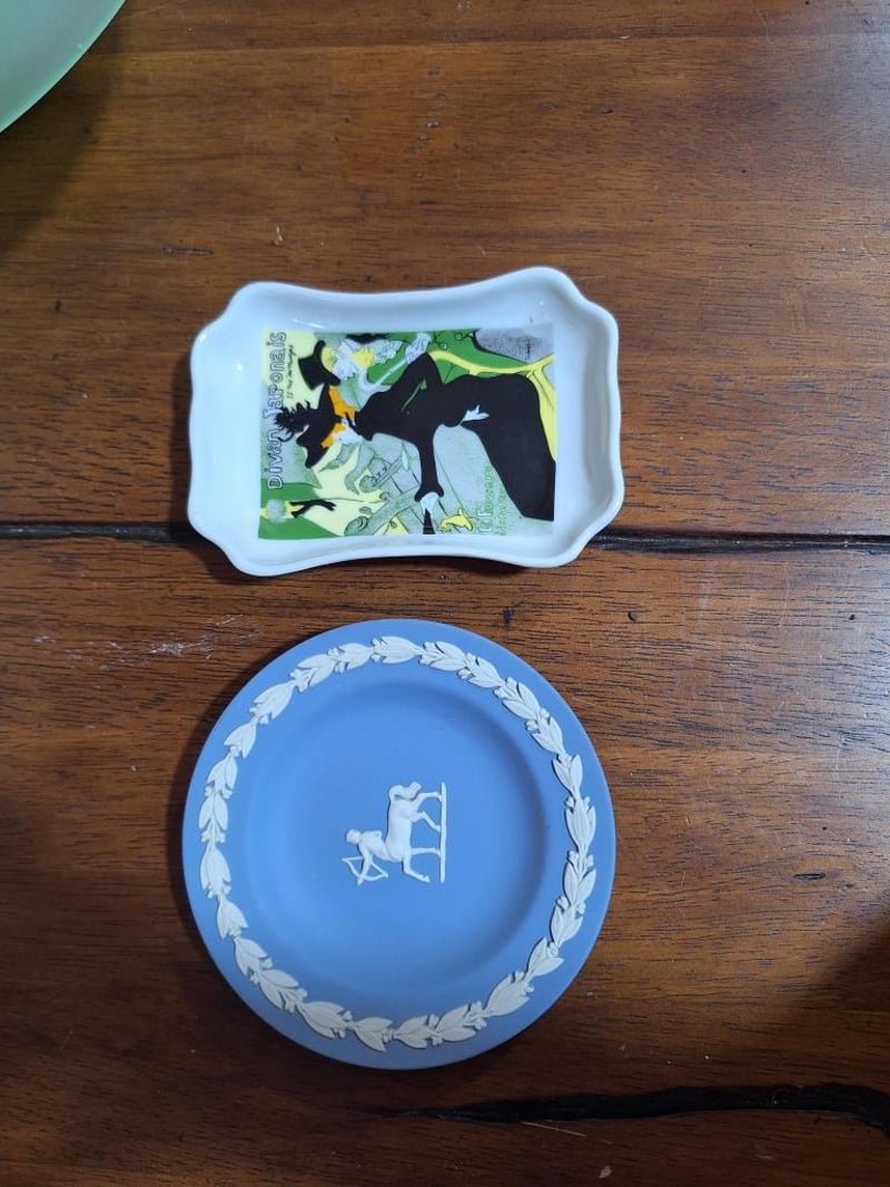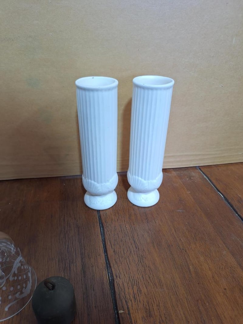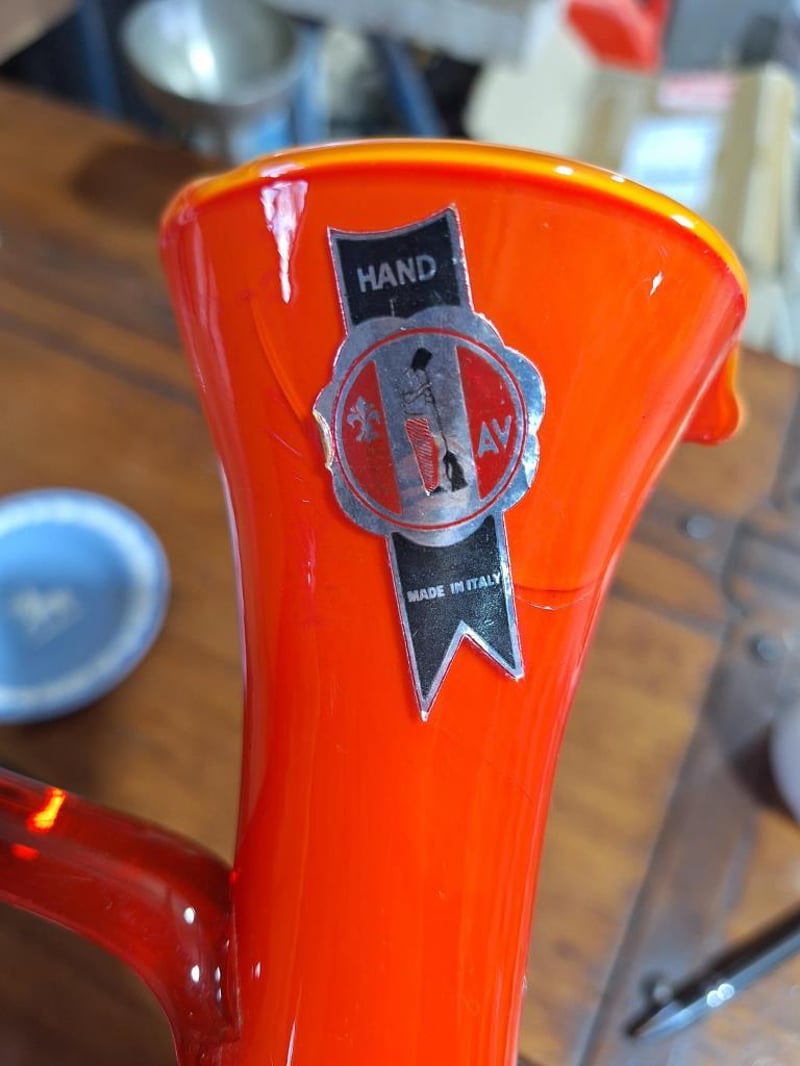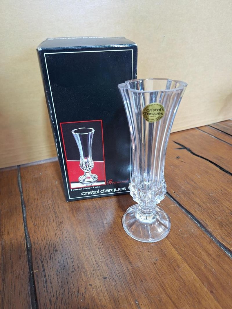 VINTAGE SET OF DÉCORVintage Set: Empoli Orange Cased Glass Jug, French Limoges Porcelain Trinket Dish, Wedgwood Blue Jasperware Trinket Dish, 2X White Fluted Vases With Japan Stamp On Base, Vintage Cristal D'Arques Bonneval 24% Lead Crystal Bud Vase Made In France, Green Depression Glass Bowl With Matching Flower Frog, Vintage Crystal Glass Bell Made In Italy And A Bell-Shaped Scale Weight. Size: 44L x 32W x 18H cmCondition: Fair - Refer Images584496+35