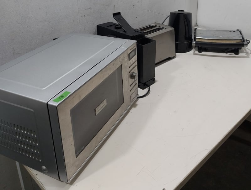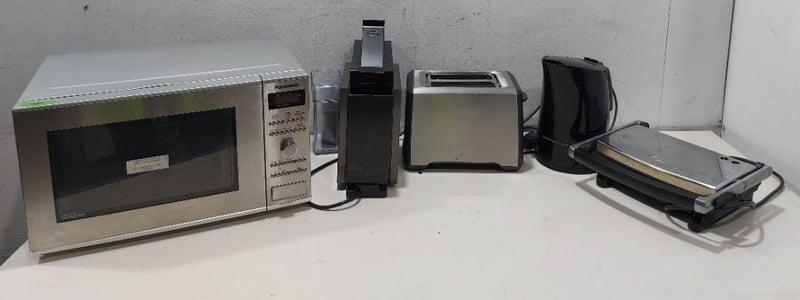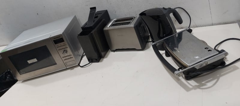 Appliances - Including Kettle, contact grill, toaster, microwave oven, capsule coffee machineNote: item is untestef, signs of wear.