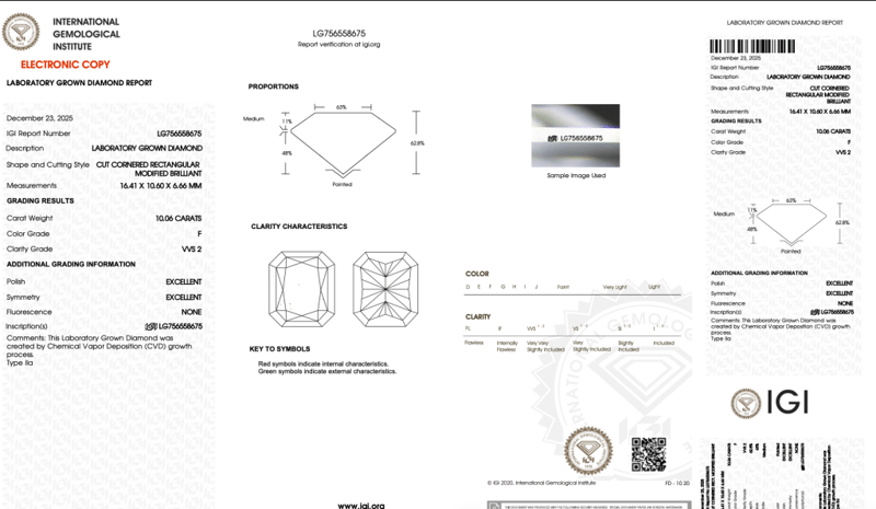 LAB GROWN DIAMOND RADIANT 10.06CT F VVS2 Accompanied By Igi & Inscripted Report Number Igi - 756558675 0 163124+36 CROSSDOCK