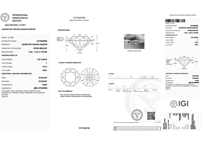 LAB GROWN DIAMOND ROUND 7.02CT F VVS2 Accompanied By Igi & Inscripted Report Number Igi - 778659058 0 163124+37 CROSSDOCK