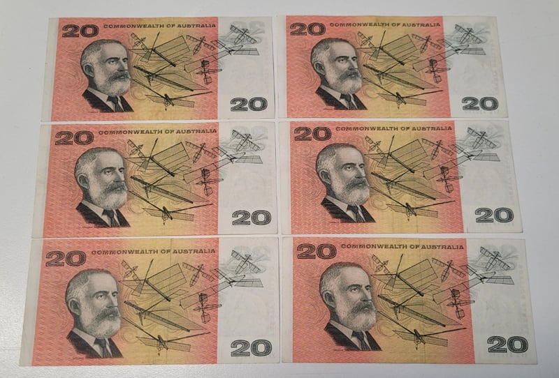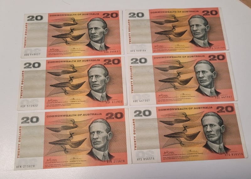 AUSTRALIAN $20 SIGNED BANKNOTE - XFS930164, XGC441567, XFS856516, XGQ048637, XGF572922, R4XFK215628, R404 488544+172