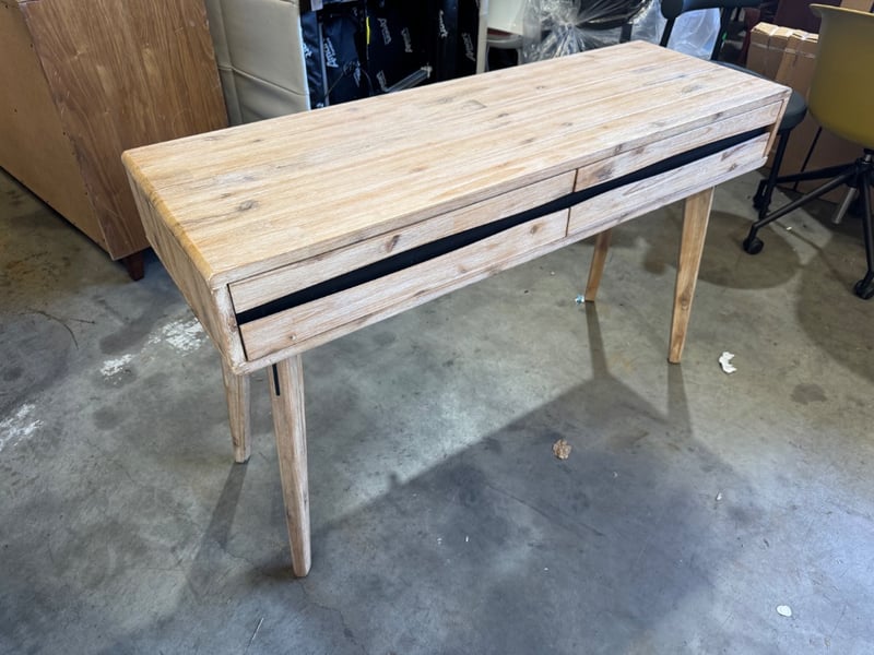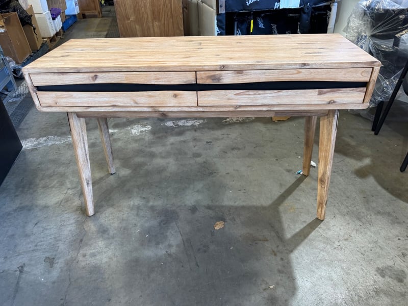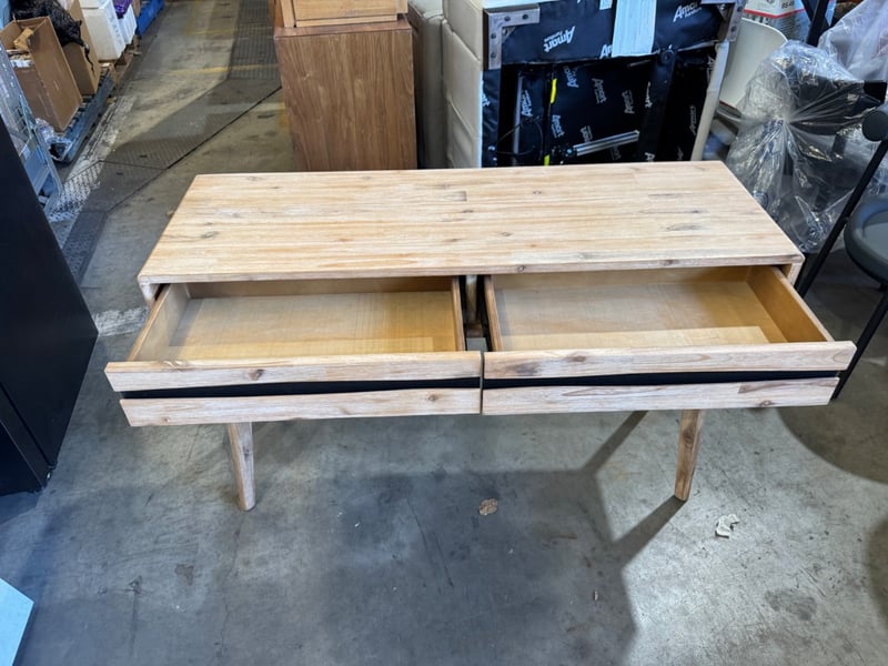 Hall table, 2 drawers, white wash finish Dimensions:123 cmW x40 cmD x 76cmHNote: minor scuffs, cleaning required