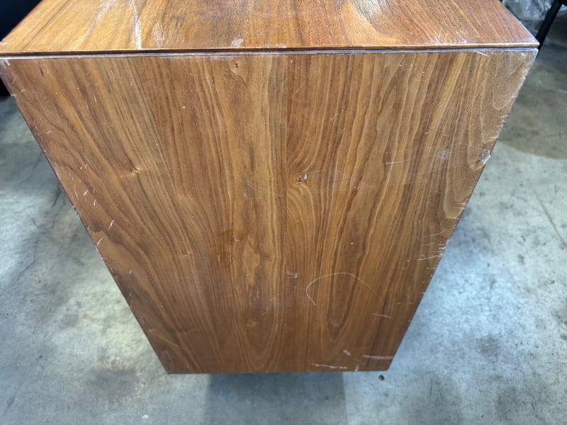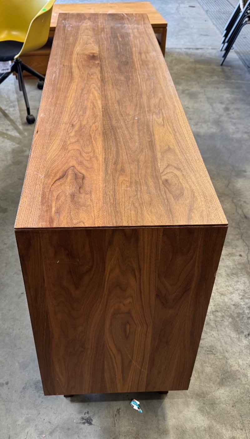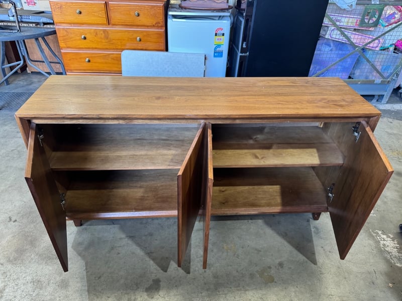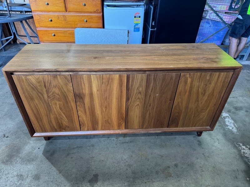 Tv unit timber, natural finish, 4 doors Dimensions: 168cmW x 45cmD x 83cmHNote: scratches, loose legs, cleaning required