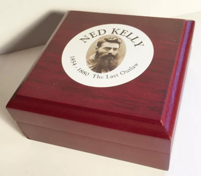 NEW "NED KELLY #4" 1/10TH OZ HGE 999 GOLD AUSTRALIANA COIN PRESENTED IN AN AWESOME WOOD DISPLAY BOX, SUCH IS LIFE