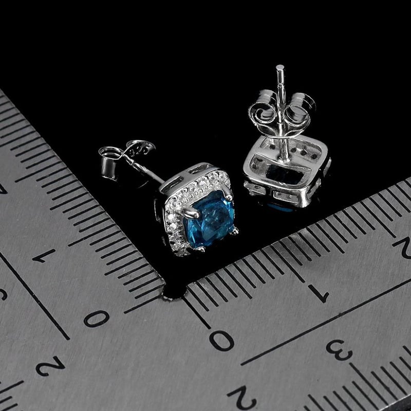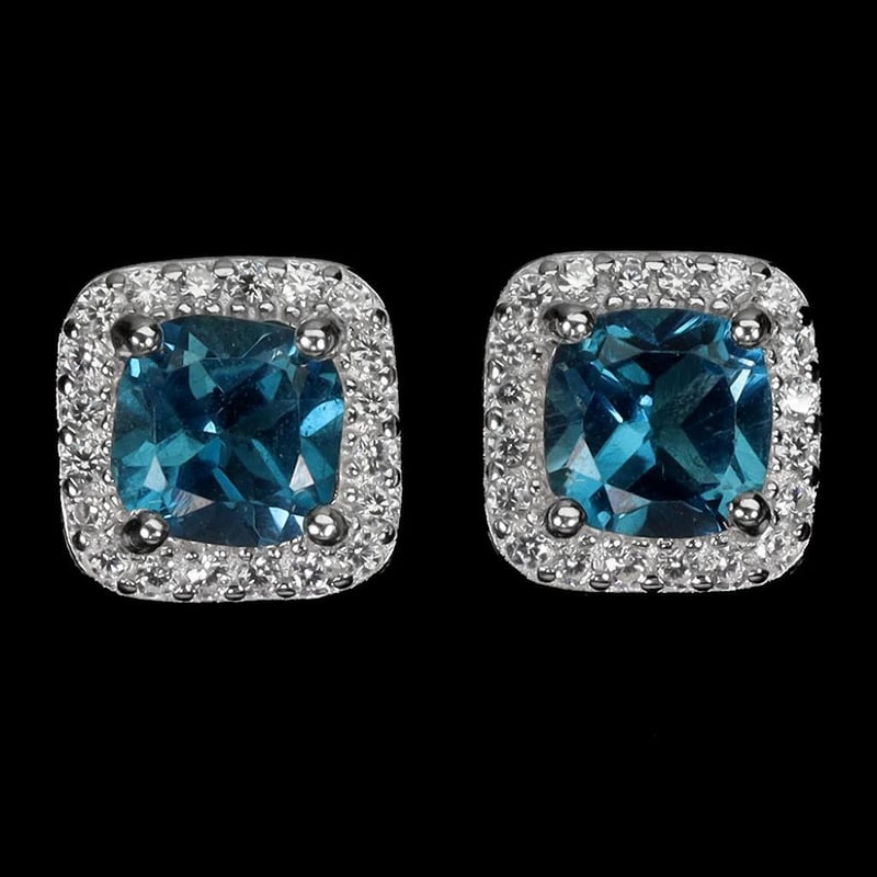 NATURAL LONDON BLUE TOPAZ EARRINGS. Natural London Blue Topaz Earrings. Made In Solid Sterling Silver And Plated In14K White Gold. Features Natural Cushion Cut London Blue Topaz Surrounded By Sparkling Czs. Earrings Measure 8.0 X 8.0 Mm. Condition: Good - Refer Images 0488577+1